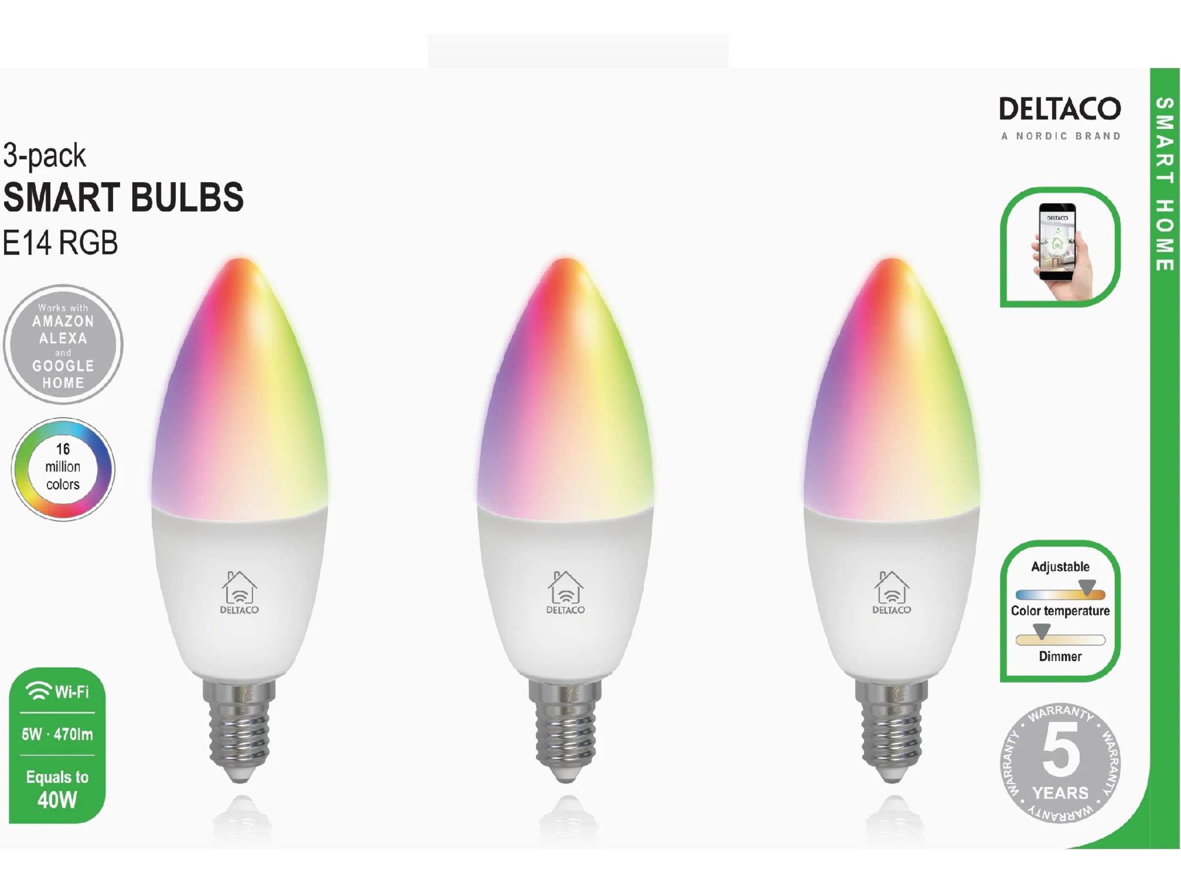 SMART HOME LED-lampa, 3-pack, E14, WiFI 2,4GHz, 5W, 470lm, dimbar, 2700K-6500K, 220-240V, RGB. SH-LE14RGB är en smart LED-lampa som kan placeras i valfri E14-lamphållare. Lampan är dimbar via appen så att du kan ställa in önskad ljusstyrka och du kan även ändra färgtemperaturen från varmvitt till kallvitt för att få rätt känsla i rummet. Effekten hos SH-LE14RGB är 5W, vilket motsvarar cirka 40W från en traditionell glödlampa.