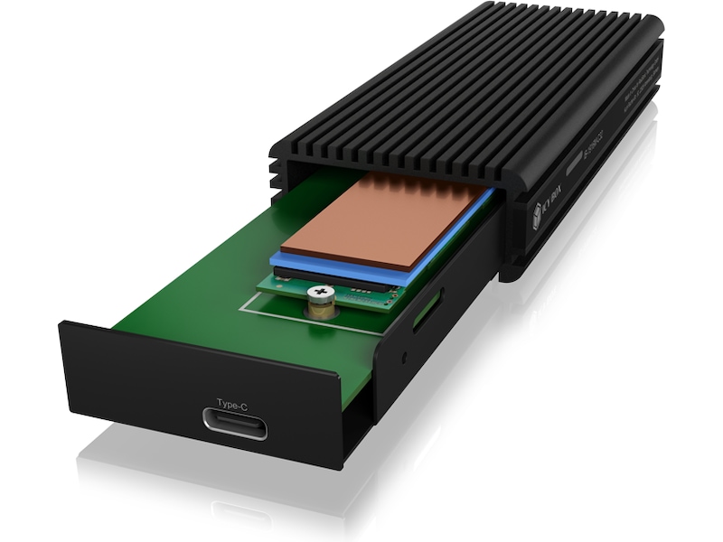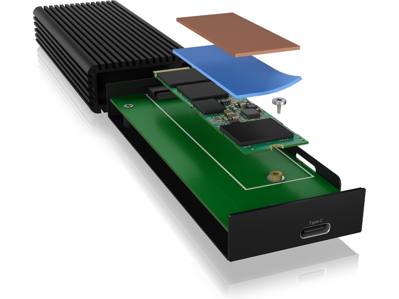• COOLING: The heat inside the heat sink is ideally conducted to the outside of the enclosure via the heat sink and the silicone heat pad. This keeps the NVMe SSD cool even under full load