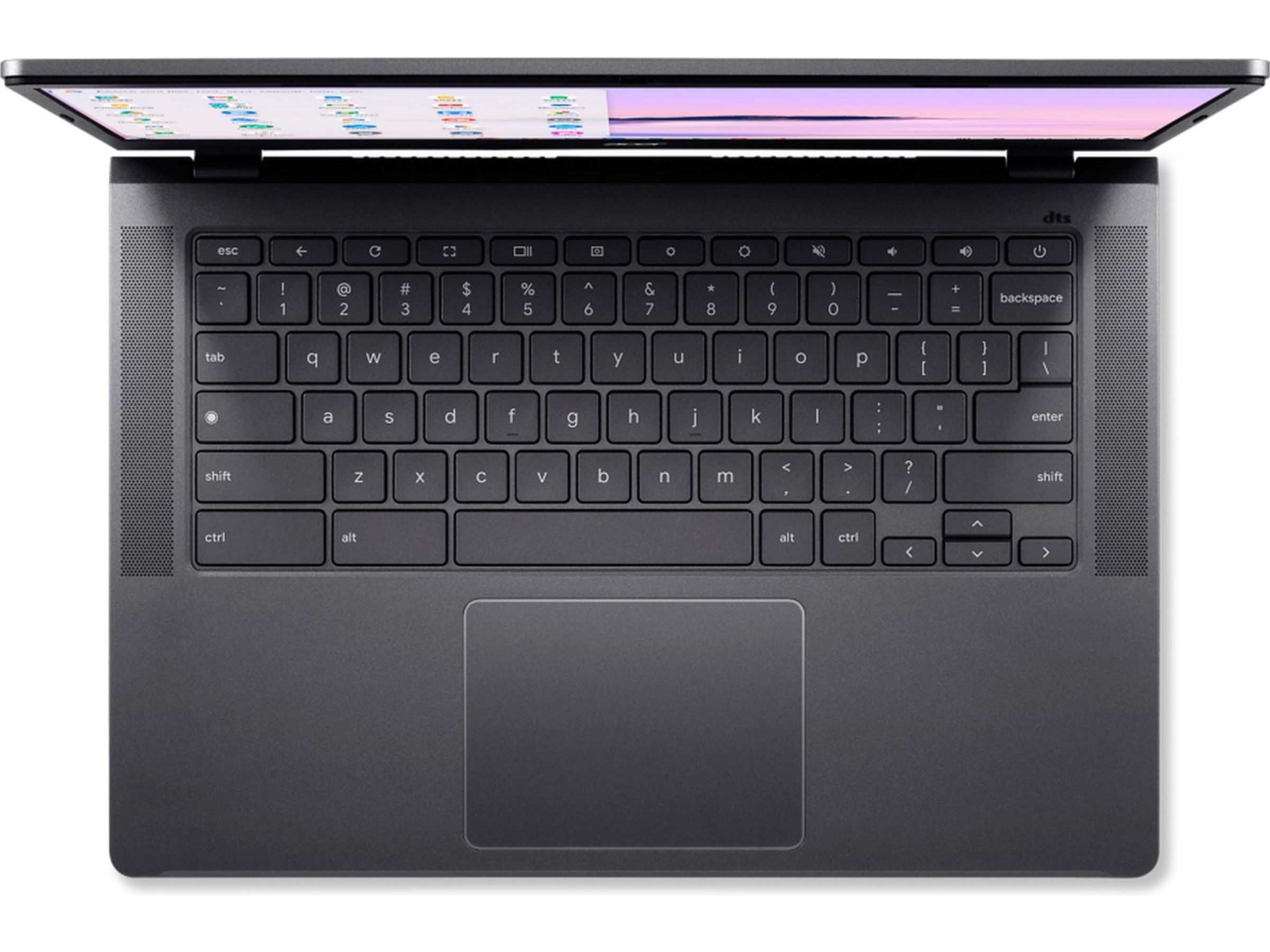 DTS® Audio och ett snabbladdande batteri med 9,5 timmars batteritid gör denna Chromebook Plus perfekt för underhållning när du är på språng. Ta med den nästan var som helst utan att behöva använda laddare samtidigt som du njuter av högkvalitativt ljud från de två uppåtriktade högtalarna.