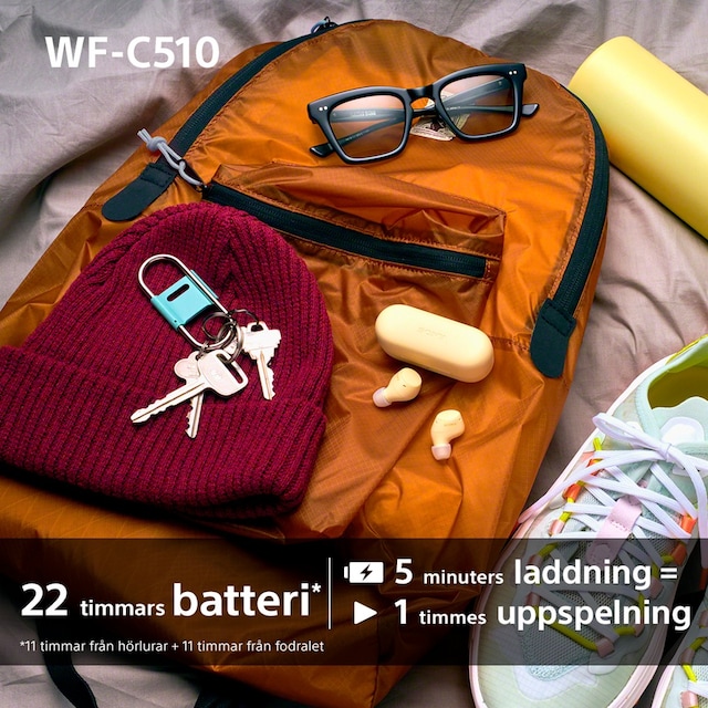 Med en vikt på endast 4,6 g per öronsnäcka är WF-C510 bland de lättaste öronsnäckorna som Sony någonsin har tillverkat. Och tack vare den nydesignade formen på öronsnäckorna är de också mycket kompakta.