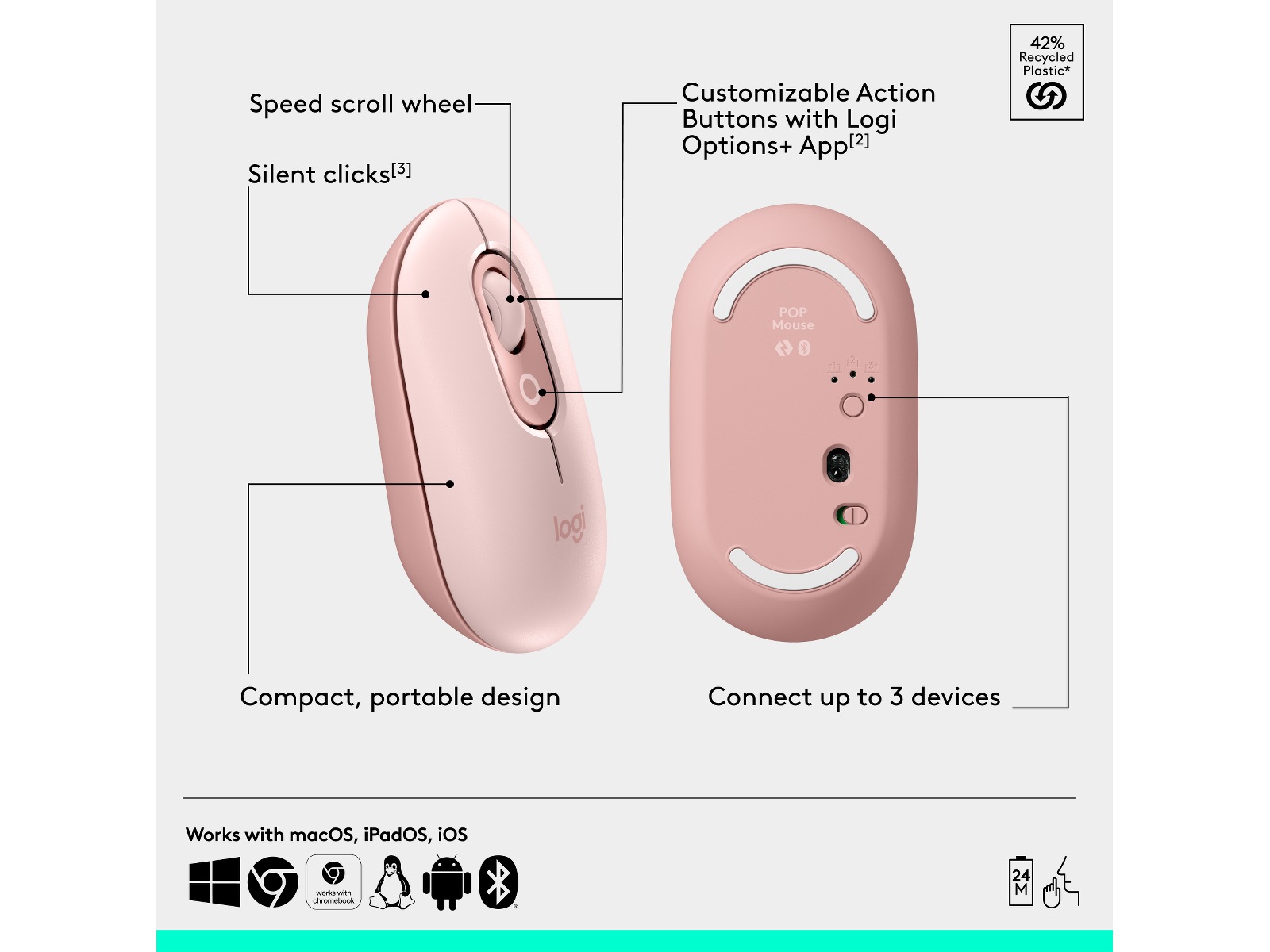 Automatiskt viloläge, Samtidiga anslutningar för 3 enheter, SilentTouch-teknik, SmartWheel, Easy-Switch-teknik, Logitech Flow, Programmerbar övre knapp, High Precision Optical Tracking |