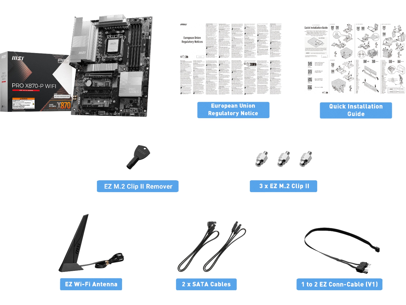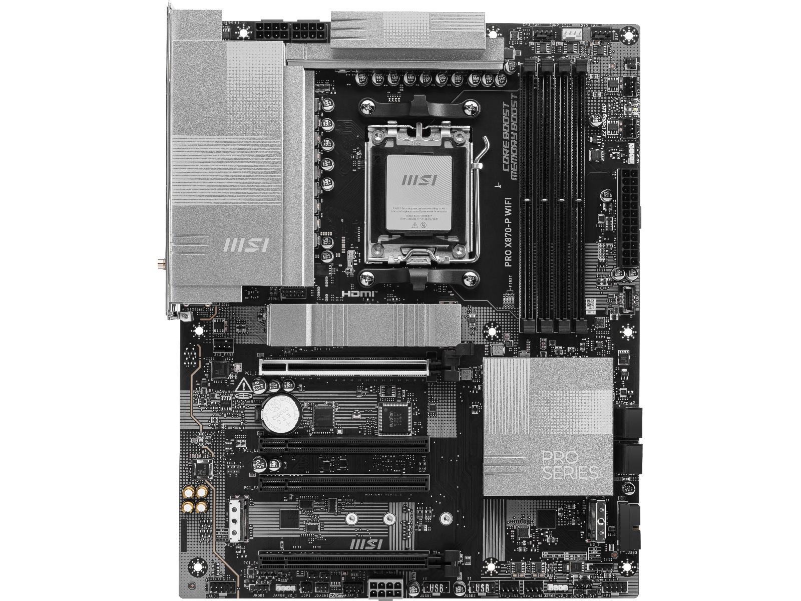 PRO X870-P WIFI erbjuder en enkel design med ett harmoniskt färgschema i silver som perfekt matchar både vita och svarta PC-byggen. Den är konstruerad med många exklusiva funktioner från MSI, en äkta Wi-Fi 7 med EZ Antenna, 5G LAN, PCIe 5.0 M.2 med EZ M.2 Shield Frozr II och extra PCIe-ström, redo för AMD Ryzen™ 9000-seriens processorer.