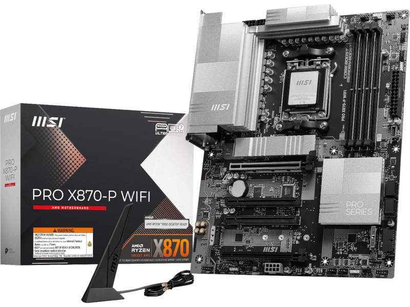 PRO X870-P WIFI erbjuder en enkel design med ett harmoniskt färgschema i silver som perfekt matchar både vita och svarta PC-byggen. Den är konstruerad med många exklusiva funktioner från MSI, en äkta Wi-Fi 7 med EZ Antenna, 5G LAN, PCIe 5.0 M.2 med EZ M.2 Shield Frozr II och extra PCIe-ström, redo för AMD Ryzen™ 9000-seriens processorer.