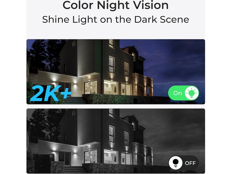 Med 2K (2560 x 1440) upplösning och inbyggda spotlights fortsätter den här batterikameran att spela in i fullfärg dag och natt, och producera skarpa, tydliga bilder för fler visuella detaljer.