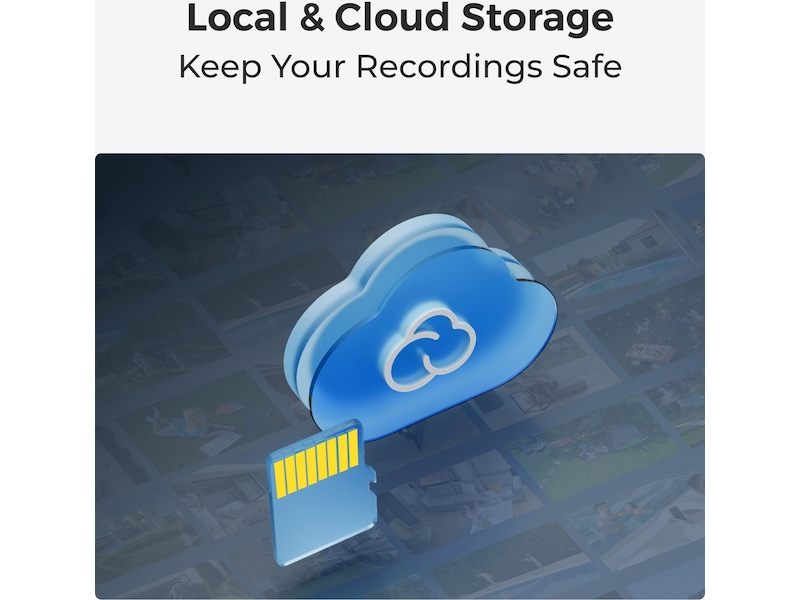 Använd ett microSD-kort (upp till 128 GB) för lokal lagring och senare uppspelning. Du kan också välja att lagra händelsevideor i Reolink Cloud. Krypterad molnlagring tar hand om din datasäkerhet.