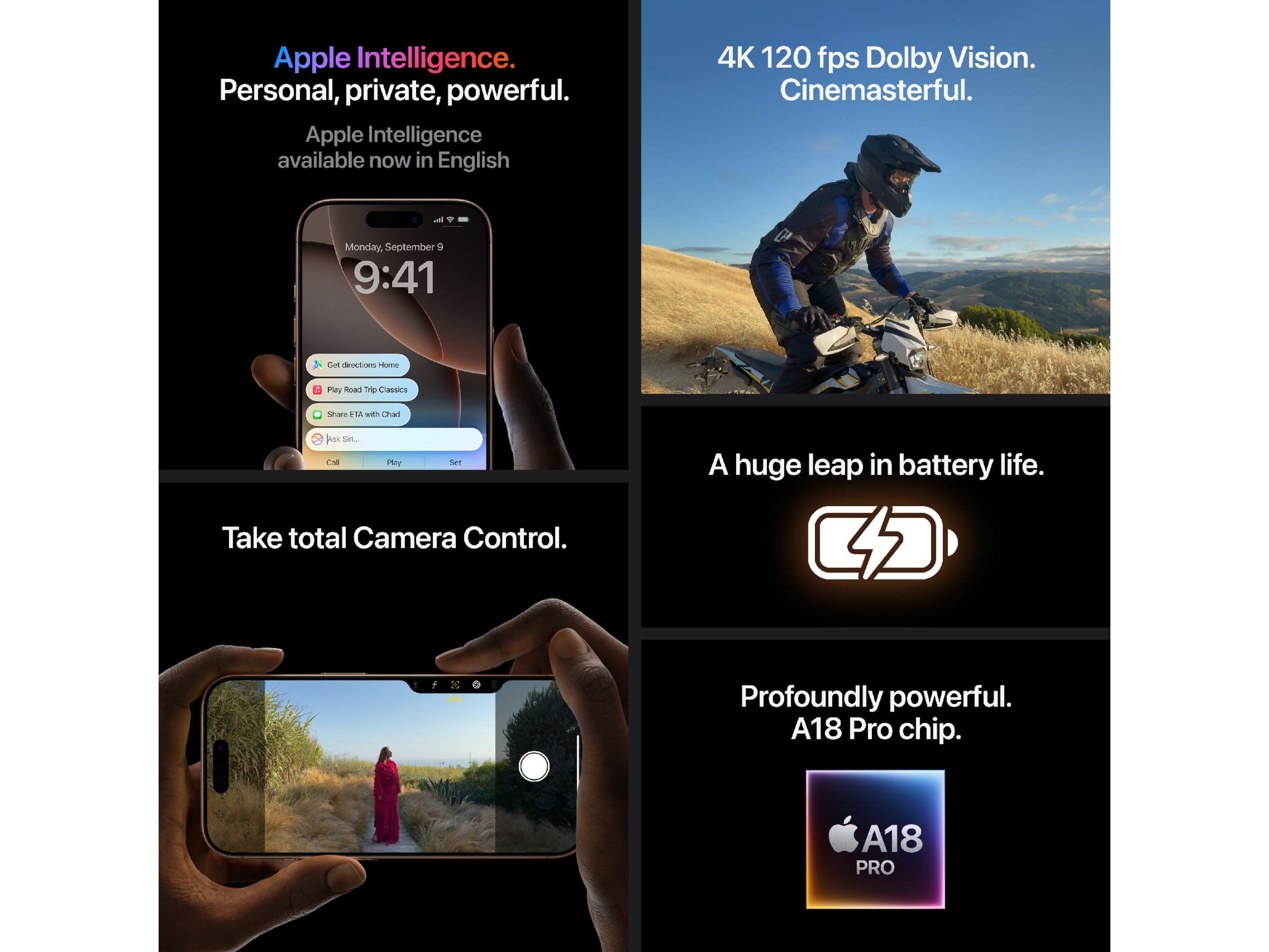 iPhone 16 Pro. Med en iögonfallande design i titan. Kamerareglage. Dolby Vision i 4K med 120 bilder/s. Och A18 Pro-chippet.