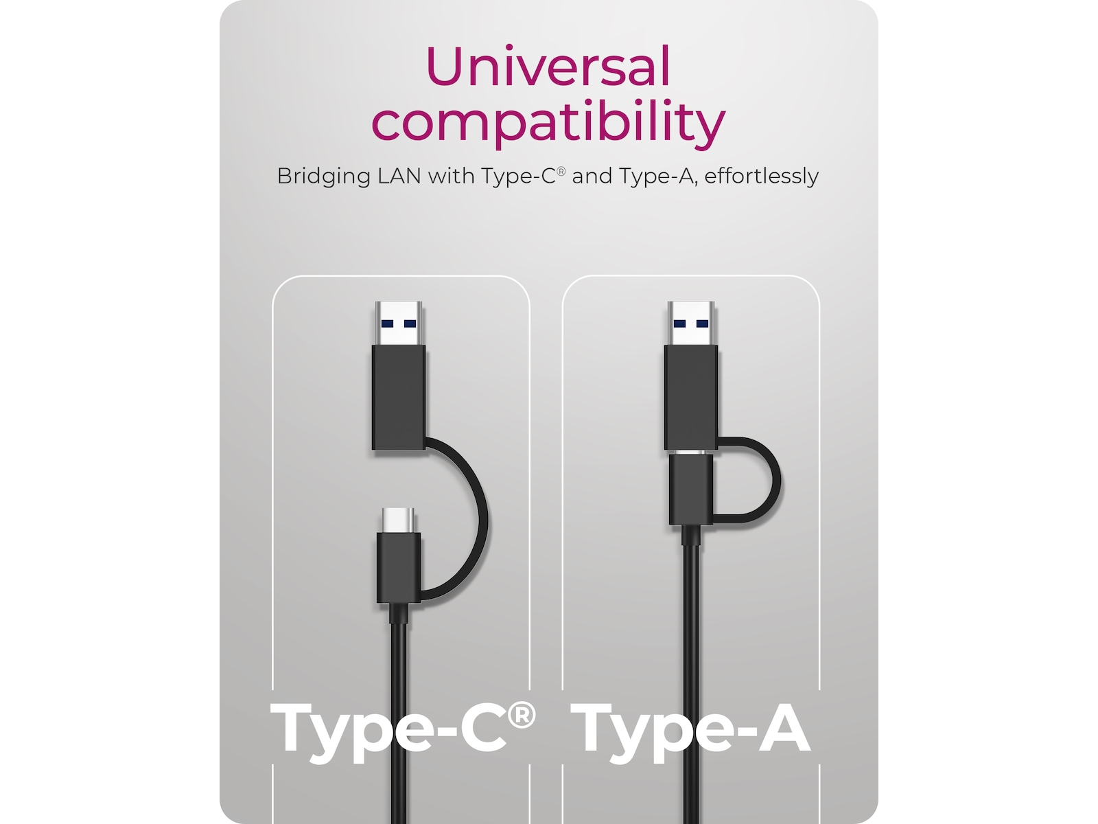 - Universell kompatibilitet: Med kombiadaptern kan du ansluta IB-LAN301-C3 till din USB Type-C®® eller USB Type-A-port. Alla operativsystem stöds så det spelar ingen roll om du använder Windows, macOS eller något annat operativsystem