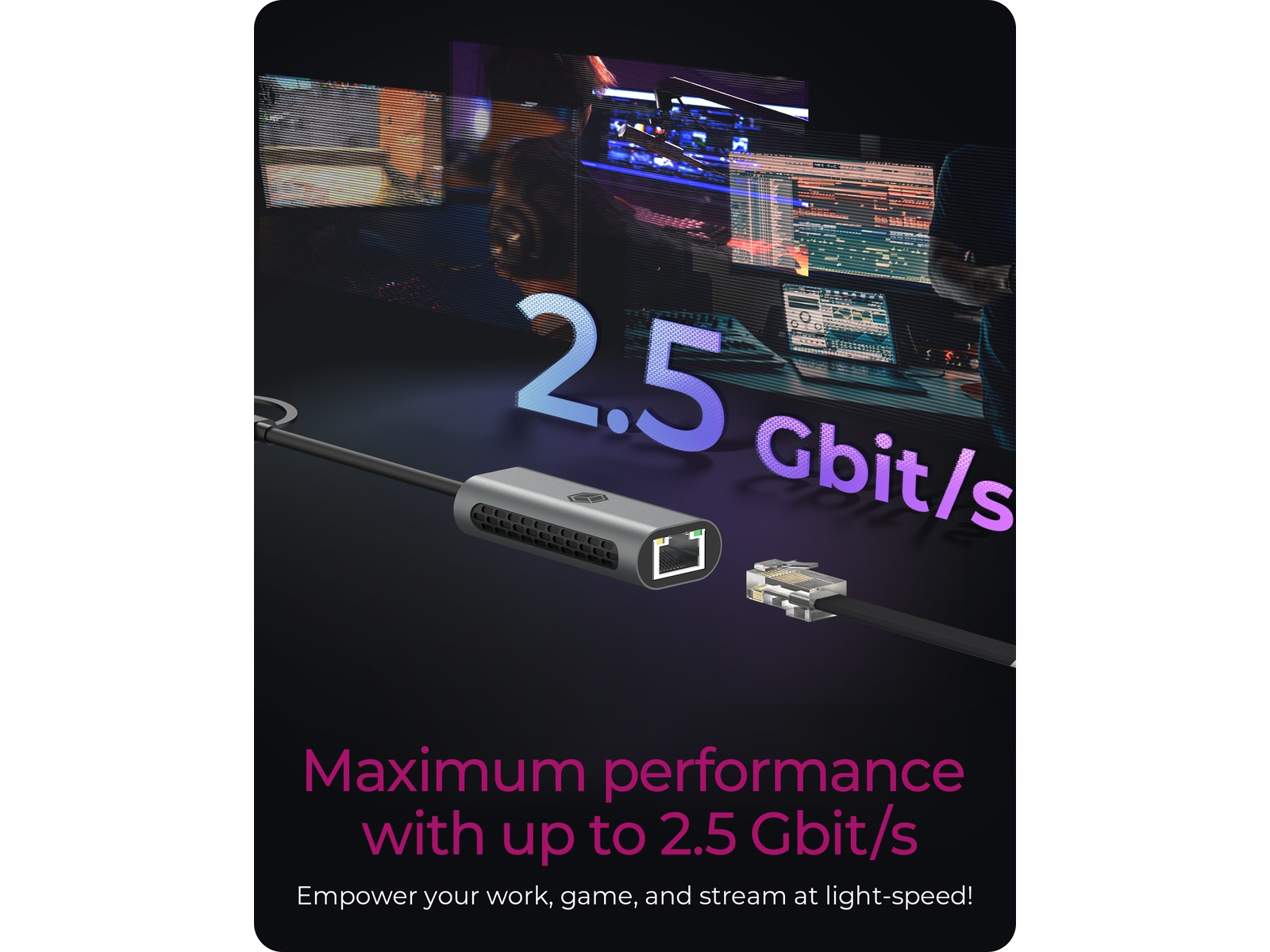 Njut av internet utan begränsningar: Med en dataöverföringshastighet på upp till 2,5 Gbit erbjuder vår adapter dig en ultrasnabb anslutning. Det betyder att du enkelt kan ladda ner stora filer, streama filmer och serier i hög upplösning eller uppleva felfritt onlinespel.