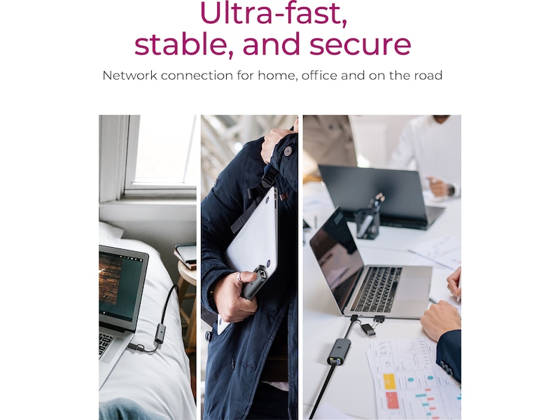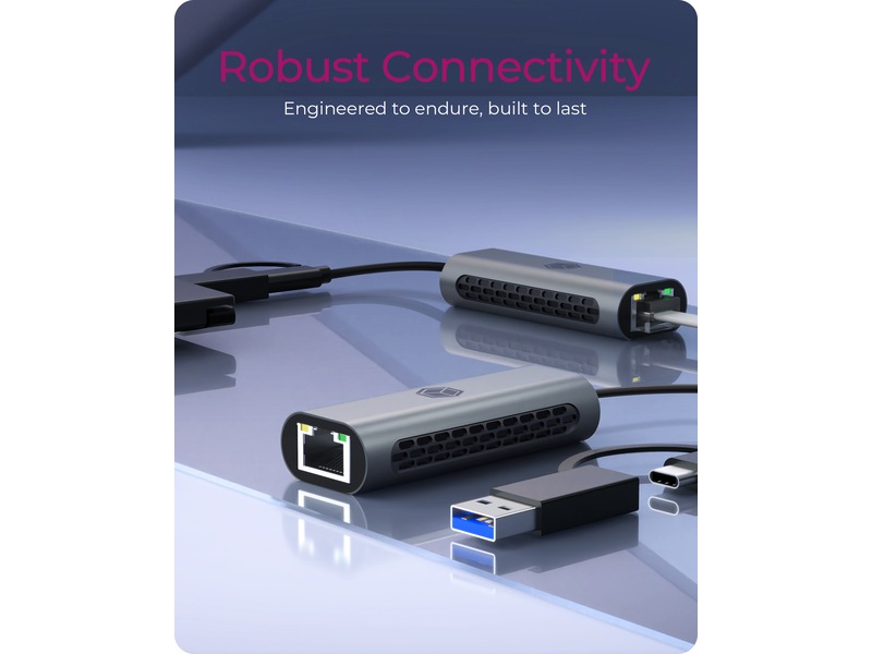 Nätverksadaptern är gjord av högkvalitativt aluminium och designad med rörlighet i åtanke. Det betyder att adaptern kan passa i nästan alla serviceväskor, ryggsäckar eller bagage. Så du kan snabbt och enkelt upprätta en trådbunden internetanslutning – oavsett om du är hemma, på jobbet eller på resande fot.
