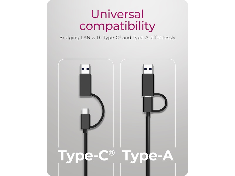 Upplev problemfria anslutningar mellan enheter. Med ett universellt dubbelt USB Type-C® och Type-A-gränssnitt kan det anslutas till nästan alla bärbara datorer, stationära datorer och till och med surfplattor och smartphones. Utan att installera några drivrutiner och kompatibel med alla operativsystem kan du komma igång direkt. Bara plug and play!