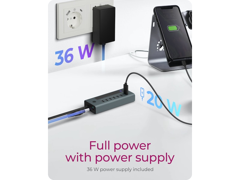 Med den medföljande 36 W strömförsörjningen får du pålitlig och snabb laddningskraft och 7 portar. Den sista portens laddningsfunktion möjliggör laddning med upp till 20 W. Och även utan en extern strömkälla är du alltid väl ansluten via de sex första USB-C-portarna.