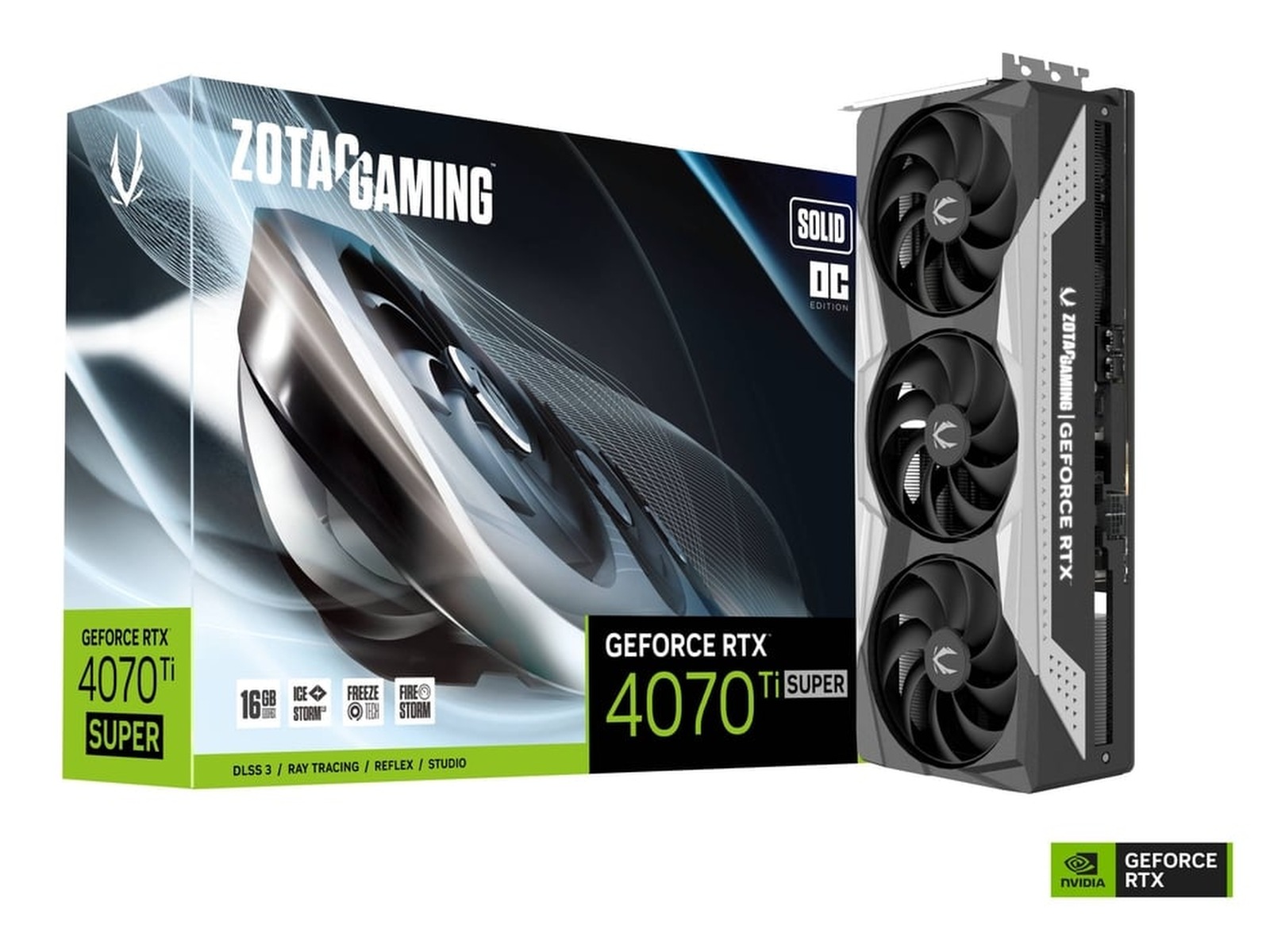 ZOTAC GAMING GeForce RTX 4070 Ti SUPER SOLID OC 16GB GDDR6X har toppmodern NVIDIA Ada Lovelace-arkitektur som ger spelare funktioner som DLSS 3.5 och realtidsraytracing, samt funktioner fokuserade på lägre temperaturer och förbättrad hållbarhet. Med större fläktar och en robustare ram är SOLID ett bra val för spelare som värdesätter funktion framför form.