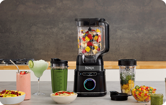 Paketet innehåller allt du behöver för att komma igång: Blender, 2,1L behållare, två 700ml-koppar, Ninja Detect Total Crushing & Chopping Blade och Hybrid Edge Blades och en användarmanual.