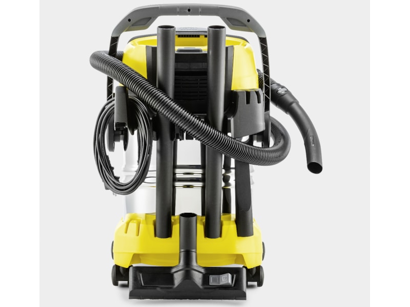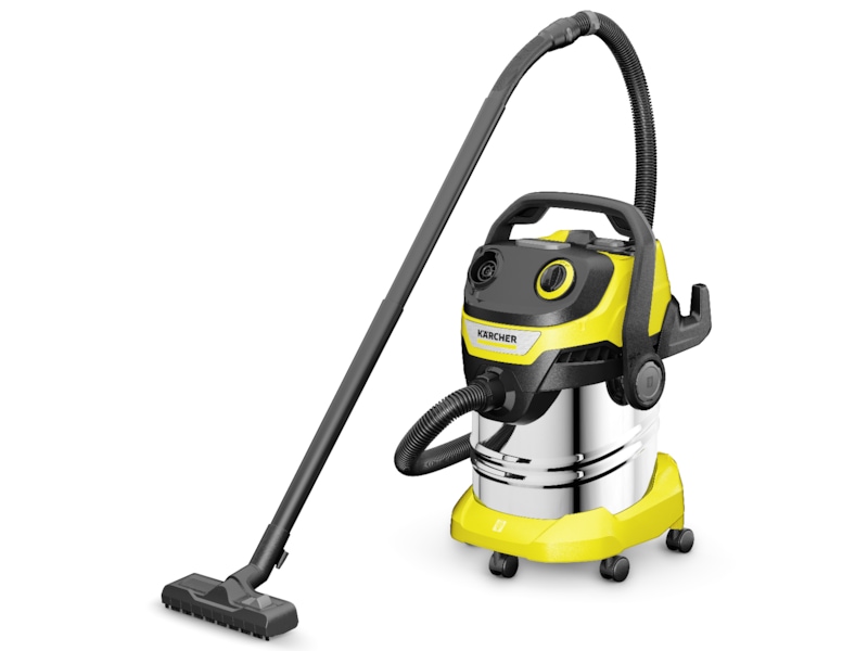 Kraftfull och energieffektiv verkstadsdammsugare: WD 5 P S Workshop med 25-liters behållare i rostfritt stål, strömuttag med automatisk av/på-brytare, filterrengöringsfunktion och specialtillbehör.