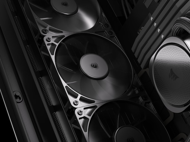 RS-fläktar skapar ett starkt luftflöde med det höga statiska tryck som krävs för att driva luft genom kylaren. CORSAIR AirGuide-teknik och Magnetic Dome-lager säkerställer bra kylprestanda och lågt ljud. - Enkla kedjade anslutningar