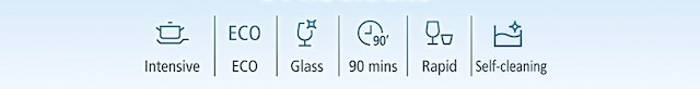 - ECO– Detta är standardprogrammet, det är lämpligt för att rengöra normalt smutsig disk och det är det mest energieffektiva programmet när det gäller dess kombinerade energi- och vattenförbrukning för denna typ av disk.