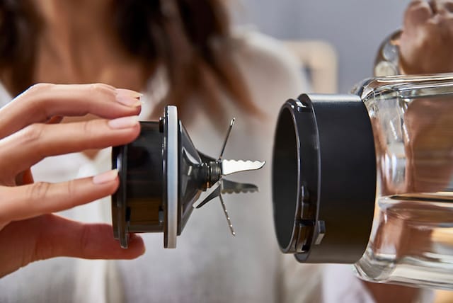 Mixern har en stor glaskanna på 1,5 liter som tål både varma och kalla vätskor. Den levereras också med en slickepott för att blanda de tjockaste ingredienserna.