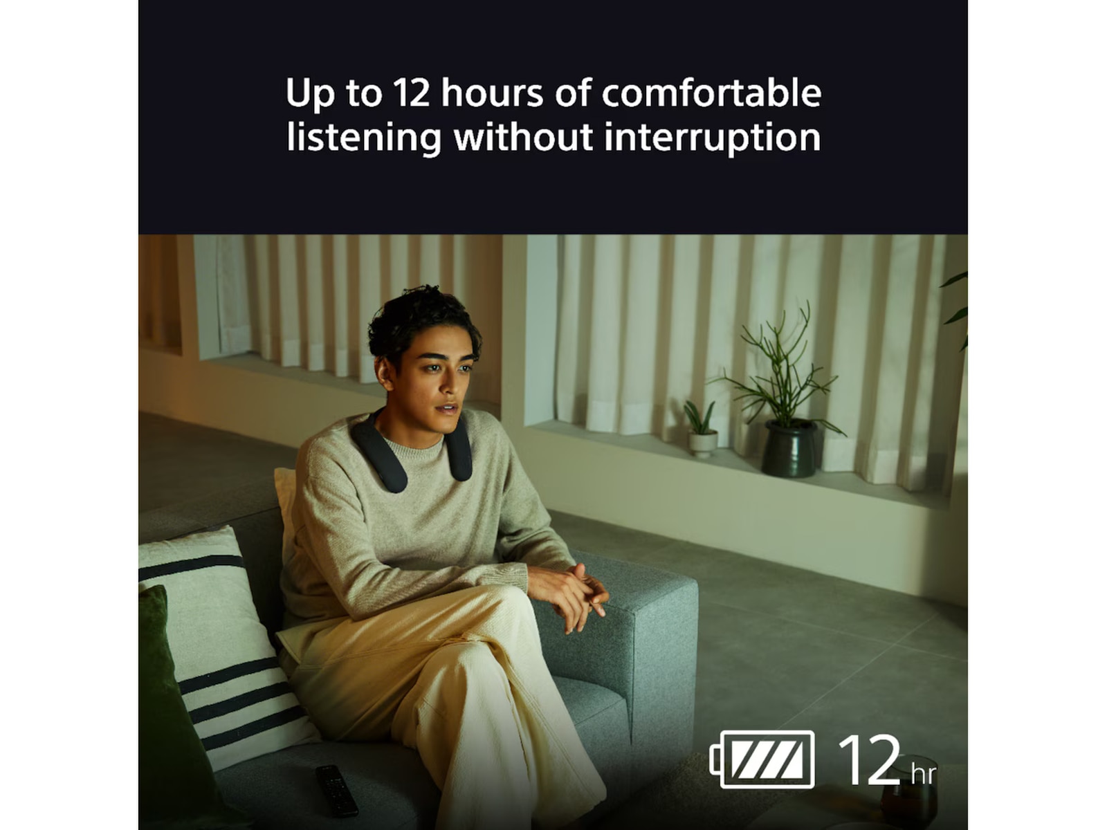 BRAVIA Theatre U är verkligen bekväm, designad för att vila mjukt runt halsen, med flexibiliteten att röra sig med dig, oavsett om du lutar dig tillbaka i soffan eller går runt i ditt hem.