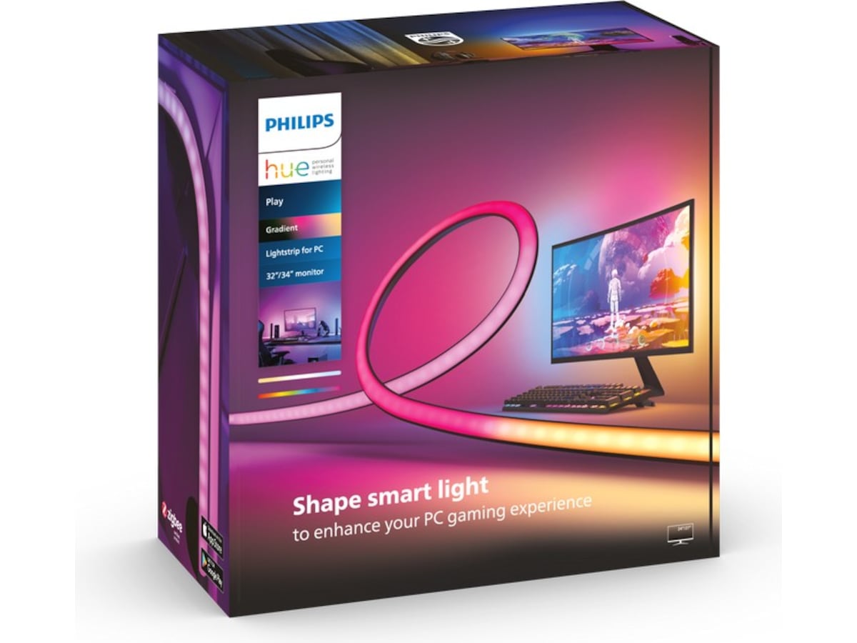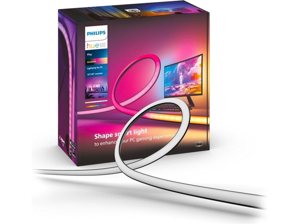 Den ingår i Hue Play gradient-serien och är utformad för att förbättra din hemunderhållning och ge dig en unik uppslukande upplevelse, där synkroniserat färgglatt ljus öppnar upp för en helt ny dimension för att njuta av ditt favoritinnehåll – oavsett om det är TV-serier, film, musik eller gaming. När du kopplar ihop din Play gradient PC lightstrip med den kostnadsfria Hue Sync-skrivbordsappen kommer din spelupplevelse att fyllas med reaktiva flerfärgade ljuseffekter som blinkar, dansar, lyser upp och byter färg i perfekt synk med vad som händer på skärmen. Den skapar fantastisk surroundbelysning på egen hand, men den kan också kombineras med andra färgkompatibla Hue-ljuskällor och lampor i ditt Hue-underhållningsområde för att förvandla hela rummet till spelets slagfält. Denna PC lightstrip passar 32"-34"-skärmar och fästs direkt på baksidan av skärmen med hjälp av det medföljande monteringsmaterialet. Den finns även för mindre skärmar och för en uppsättning med tre skärmar. Den kräver en Hue Bridge (ingår inte).