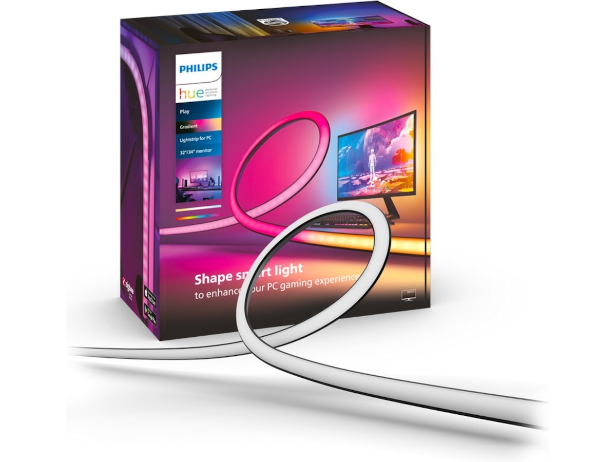 Den ingår i Hue Play gradient-serien och är utformad för att förbättra din hemunderhållning och ge dig en unik uppslukande upplevelse, där synkroniserat färgglatt ljus öppnar upp för en helt ny dimension för att njuta av ditt favoritinnehåll – oavsett om det är TV-serier, film, musik eller gaming. När du kopplar ihop din Play gradient PC lightstrip med den kostnadsfria Hue Sync-skrivbordsappen kommer din spelupplevelse att fyllas med reaktiva flerfärgade ljuseffekter som blinkar, dansar, lyser upp och byter färg i perfekt synk med vad som händer på skärmen. Den skapar fantastisk surroundbelysning på egen hand, men den kan också kombineras med andra färgkompatibla Hue-ljuskällor och lampor i ditt Hue-underhållningsområde för att förvandla hela rummet till spelets slagfält. Denna PC lightstrip passar 32"-34"-skärmar och fästs direkt på baksidan av skärmen med hjälp av det medföljande monteringsmaterialet. Den finns även för mindre skärmar och för en uppsättning med tre skärmar. Den kräver en Hue Bridge (ingår inte).
