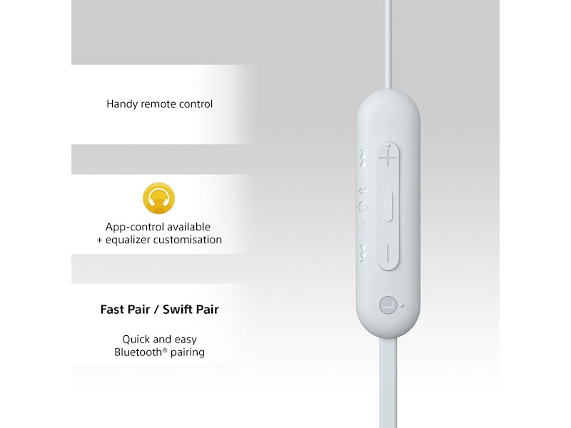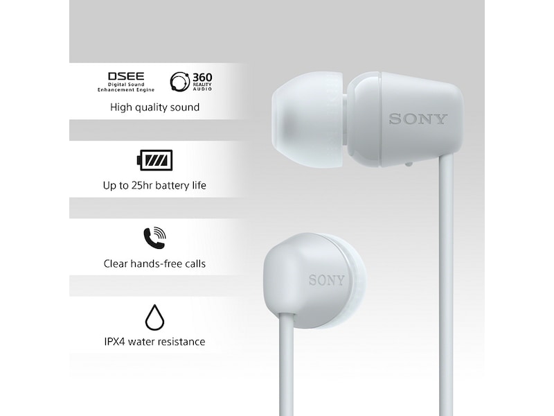 WI-C100 ger trådlösa hörlurar för nybörjare en helt ny definition. Med den goda ljudkvaliteten från Sony ger de en rik lyssningsupplevelse, samtidigt som en lång batteritid på 25 timmar och en stänksäker design ger dig sinnesfrid när du är på språng. De är också kompatibla med Sony | Headphones Connect-appen, så att du kan justera ljudet som du vill ha det.