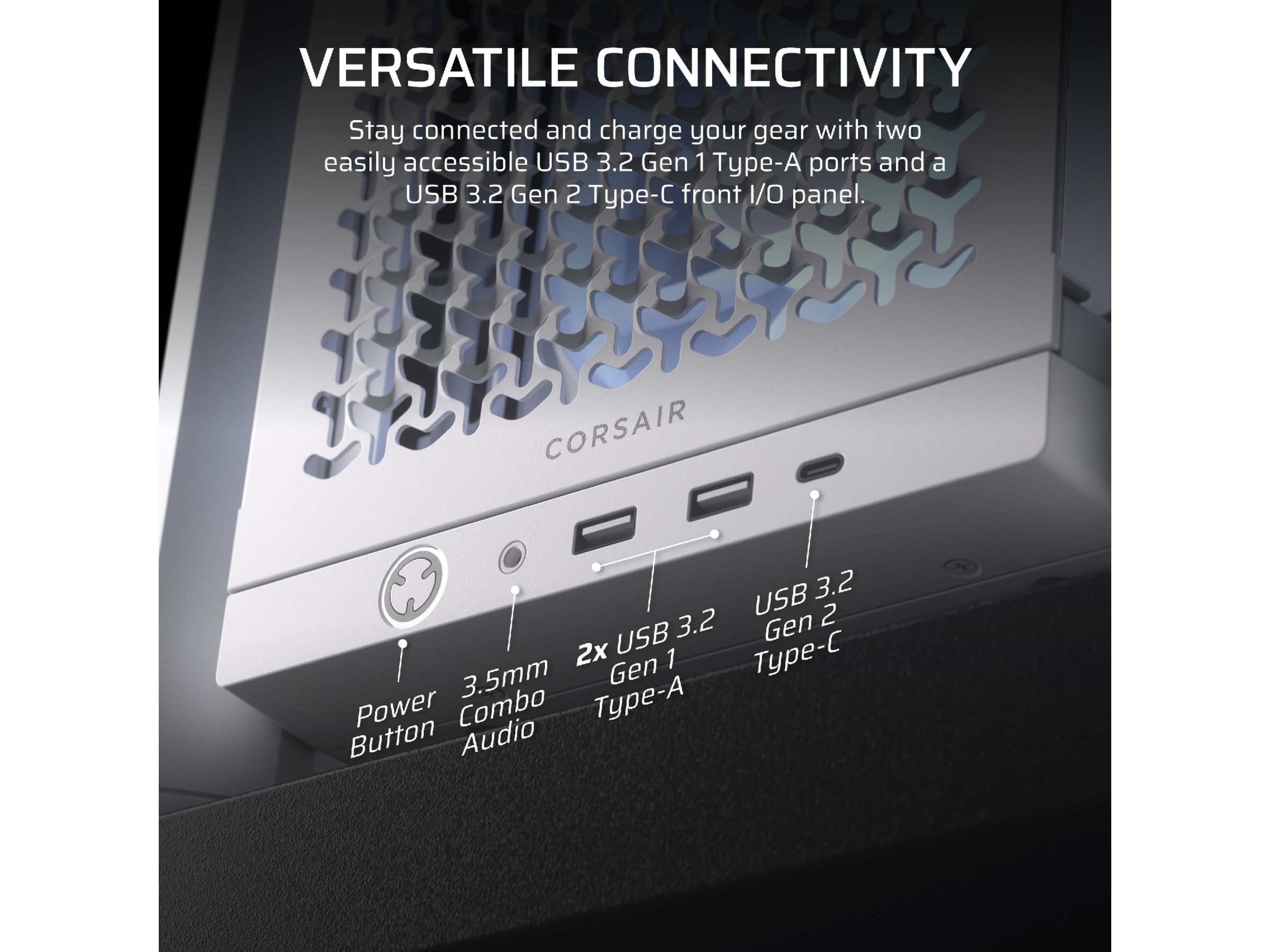 Håll kontakten och ladda din utrustning med två lättillgängliga USB 3.2 Gen 1 Type-A-portar och en USB 3.2 Gen 2 Type-C front I/O-panel. Vill du ha olika kopplingar? Bättre hastighet? En annan layout? I/O-panelen är lätt att byta ut med uppgraderingar tillgängliga på corsair.com.