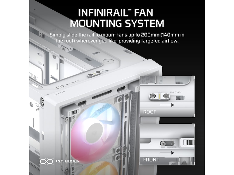 Oroa dig aldrig för om dina fläktar kommer att passa där du vill att de ska någonsin igen. Flerpunktsmonteringssystemet i stål erbjuder oöverträffad flexibilitet på de främre och takfläktarnas monteringsplatser, ger gott om justeringar för dig att montera upp till 200 mm fläktar framför eller 140 mm fläktar ovanpå och rikta deras luftflöde direkt mot dina hetaste komponenter.