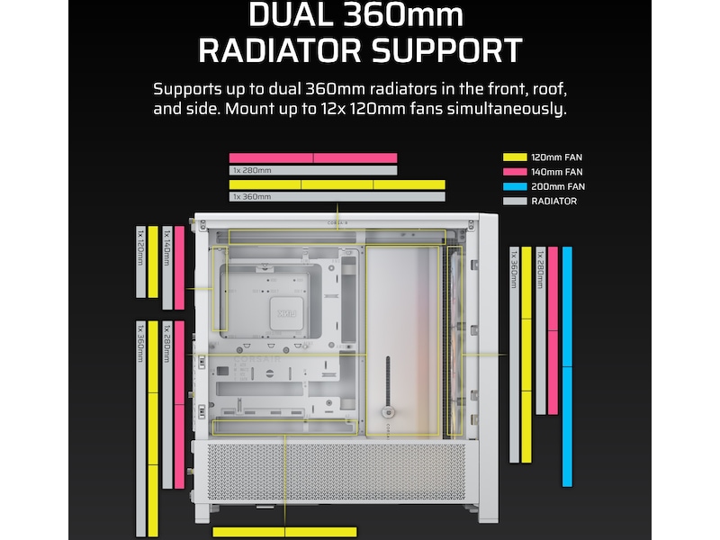 Ta din kylning till nästa nivå med tre monteringsplatser för 360 mm radiatorer (fram, tak och sida). Montera upp till 12x 120 mm fläktar samtidigt för att hålla kall luft strömmande in och varm luft släppas ut snabbt och effektivt.