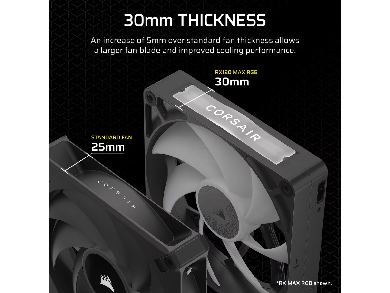 Vid 30 mm är RX MAX RGB-fläktar 20 % tjockare än vanliga PC-kylfläktar. Detta leder direkt till ytterligare kylkraft för din PC, med starkare luftflöde och statiskt tryck som genereras av det större fläktbladet.