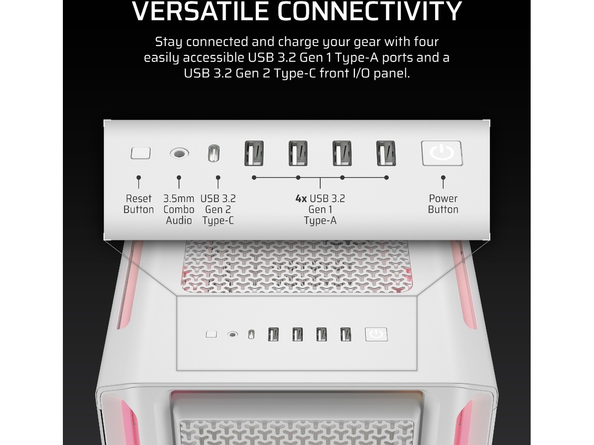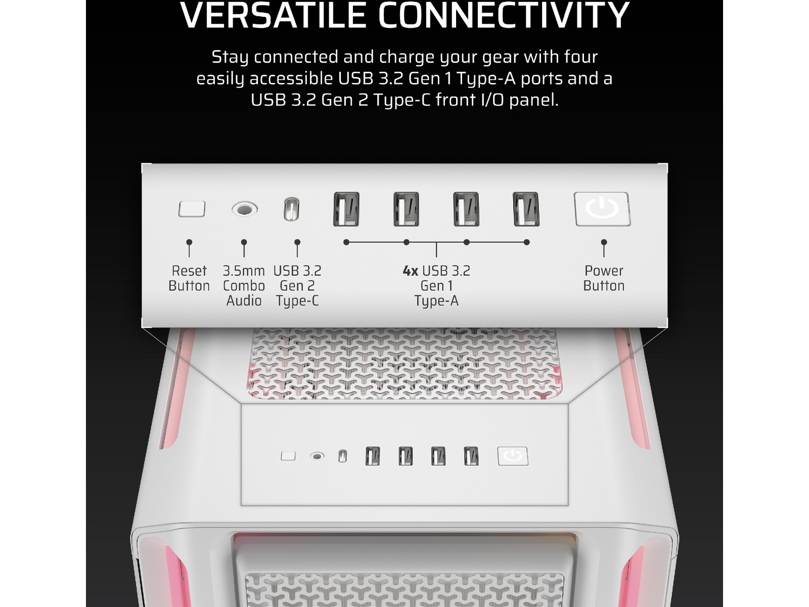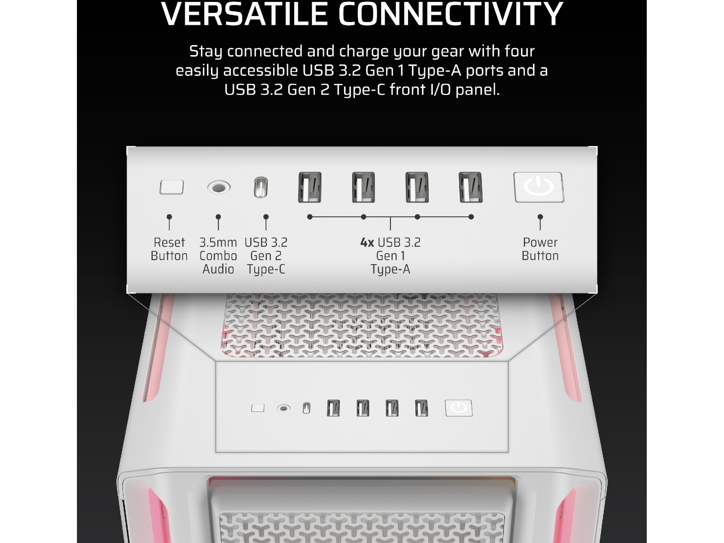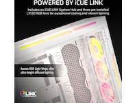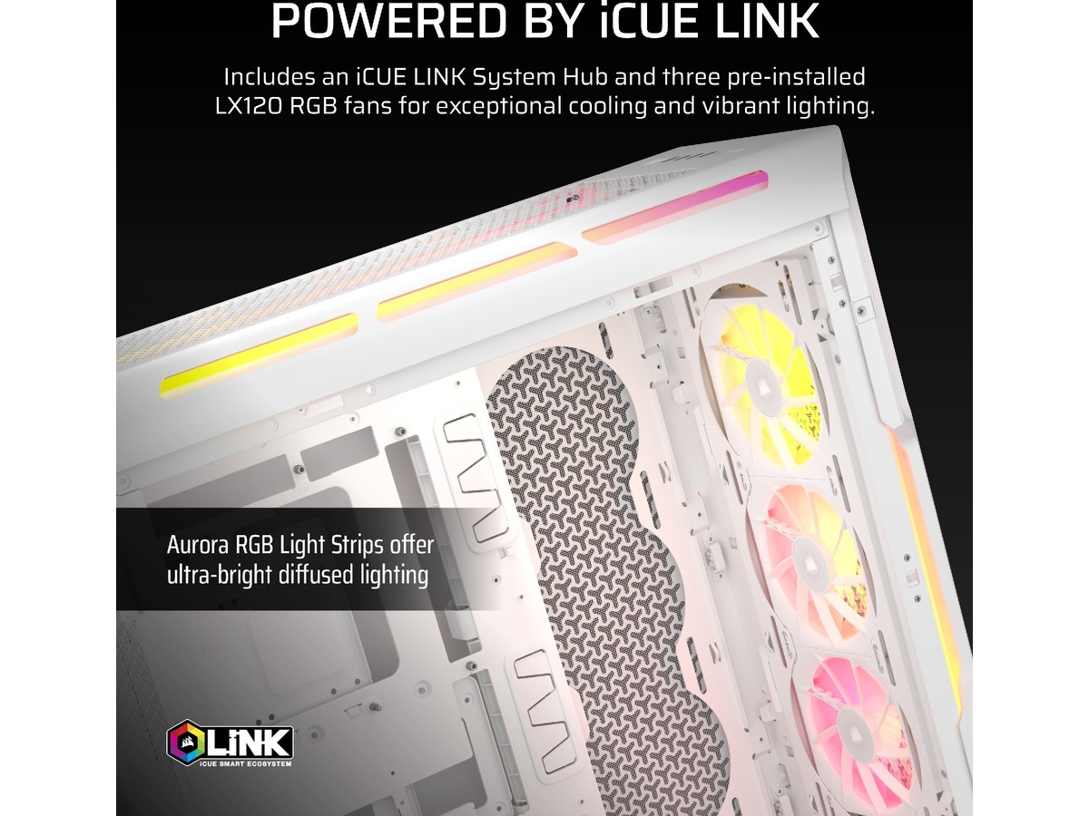 CORSAIR 5000T LX RGB gör ett slående intryck med sitt eleganta, unikt utformade chassi och integrerade Aurora RGB Light Strips. Kickstarta ditt iCUE LINK-drivna system med den medföljande System Hub och tre förinstallerade iCUE LINK LX120 RGB-fläktar, vilket säkerställer utmärkt kylning och levande belysning. De ultraljusa Aurora Light Strips ger jämn, diffus belysning utan hotspots.