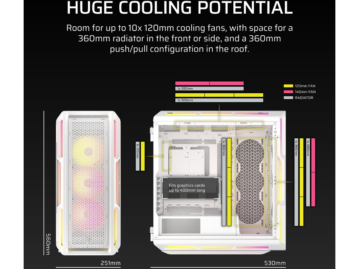 Den rymliga interiören rymmer upp till 10x 120 mm eller 4x 140 mm kylfläktar, samt flera 60 mm tjocka radiatorer, inklusive upp till 360 mm fram eller sida och en 360 mm tryck/drag i taket .