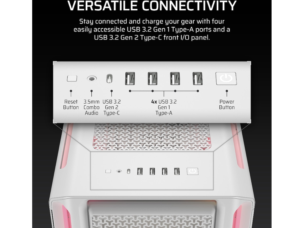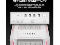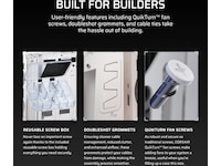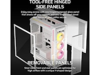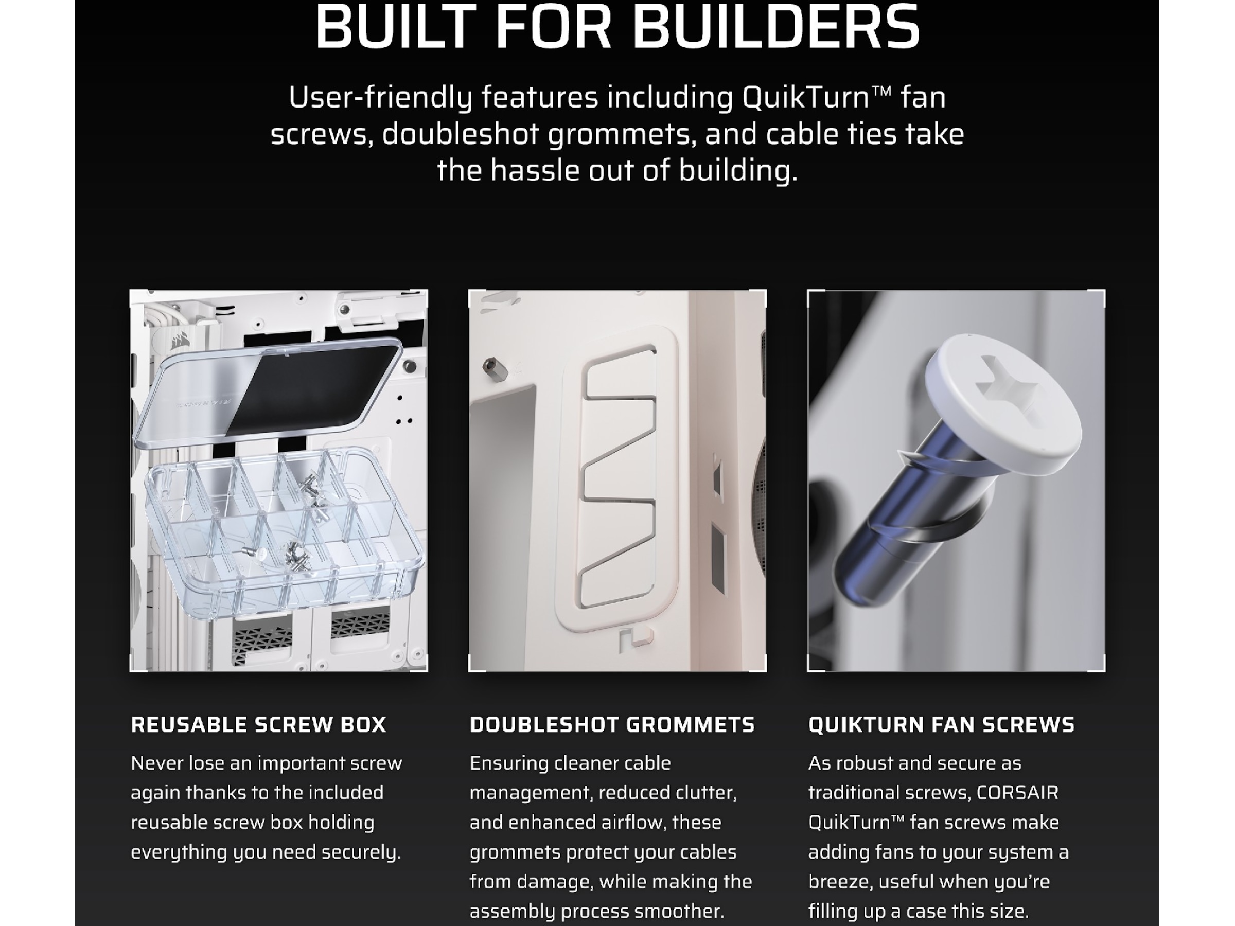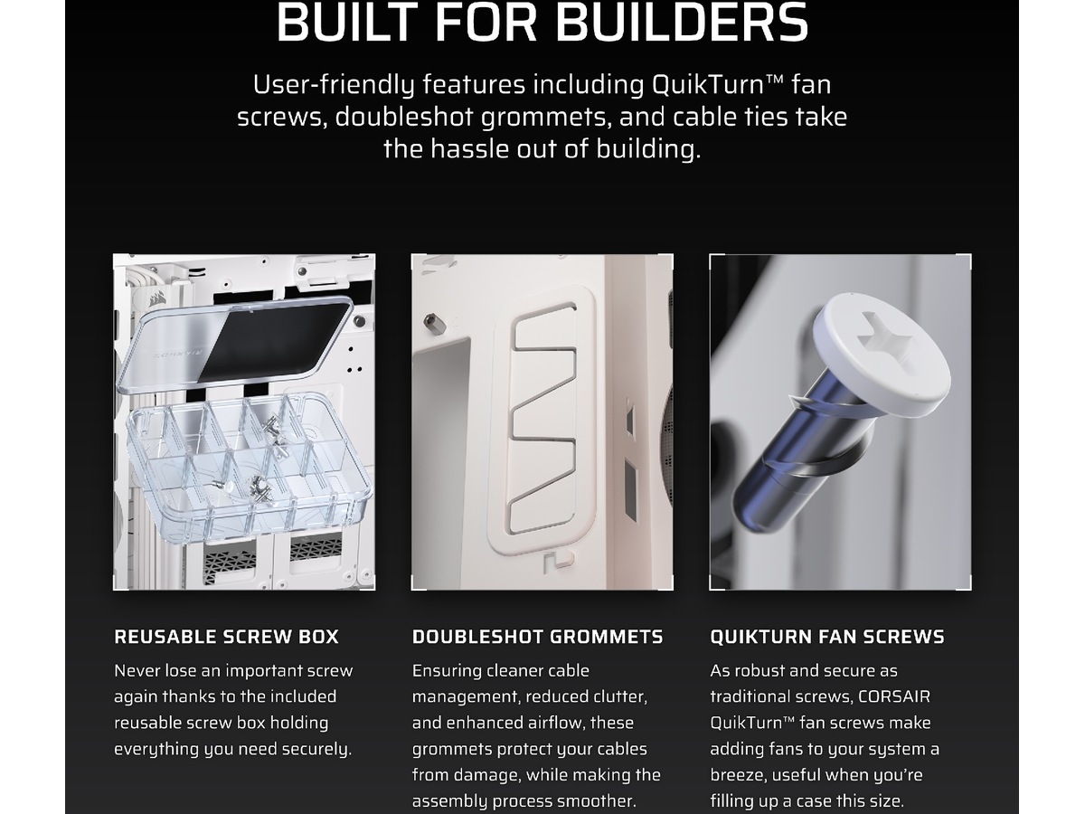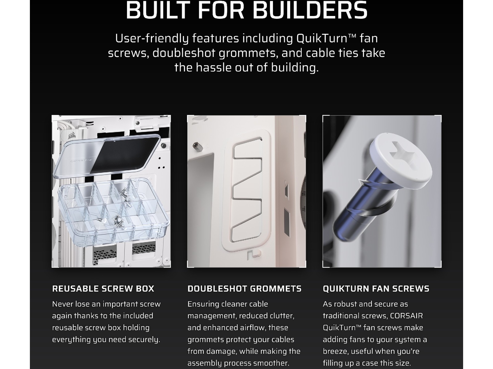 En rad CORSAIR-innovationer förbättrar byggupplevelsen, inklusive vertikalt monteringsstöd utan extra fästen, envridande Quikturn-skruvar, flexibla dubbelskottsgenomföringar och externa utskärningar för kabel ledning.