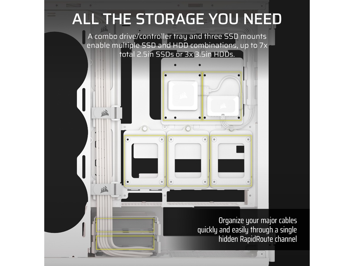 Byggarvänliga funktioner, inklusive CORSAIR RapidRoute-kabelhanteringssystem, effektiviserar din konstruktion genom att låta dig dra kablar genom en enda dold kanal. Ytterligare förmåner som vertikalt monteringsstöd, verktygsfria sidopaneler med gångjärn och gott om förvaringsmöjligheter förbättrar byggupplevelsen. Med två kombinerade enhetsfack och tre SSD-fästen erbjuder 5000T LX RGB allt du behöver för att skapa en fantastisk, högpresterande PC.