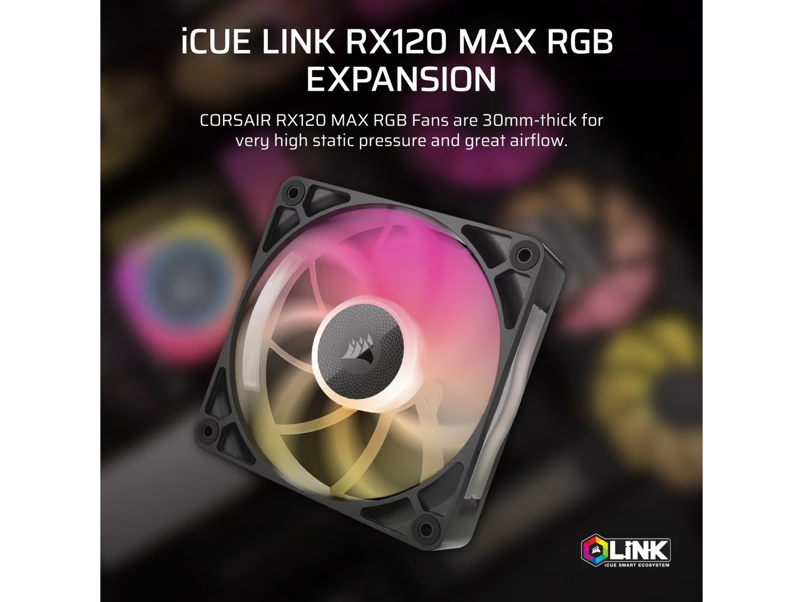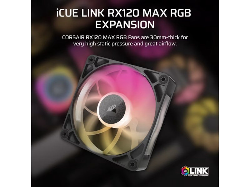 CORSAIR RX120 MAX RGB-fläktar är 30 mm tjocka för mycket högt statiskt tryck och bra luftflöde, samtidigt som de lyser upp din dator med åtta RGB-lysdioder och anslutna med sömlös iCUE LINK-teknik.