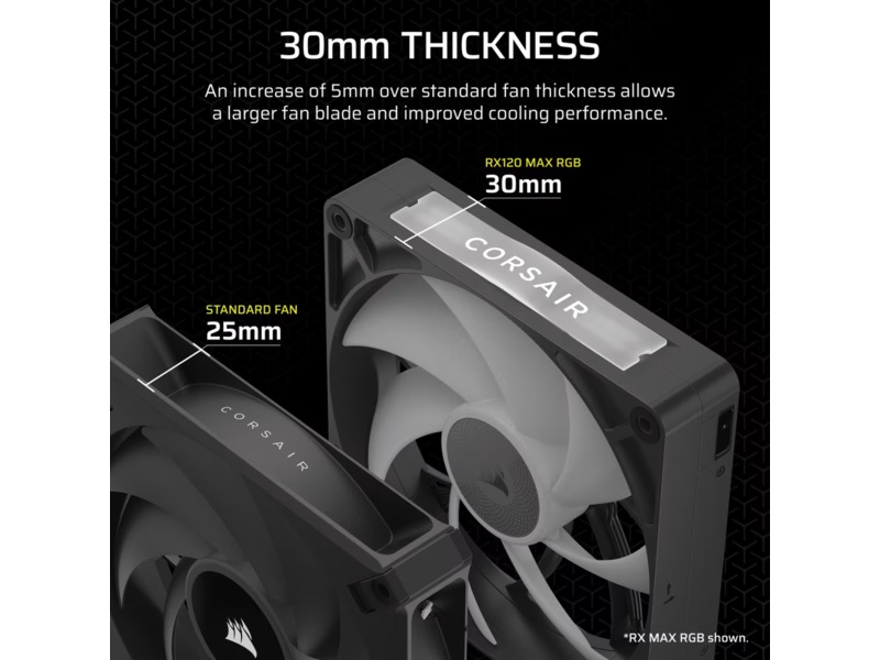 5 mm tjockare fläktblad förbättrar kylningsprestanda genom att flytta mer luft i samma hastighet som tunnare fläktar. RX MAX RGB-fläktar kan också gå tystare, eftersom de kan snurra långsammare för att producera samma luftflöde.