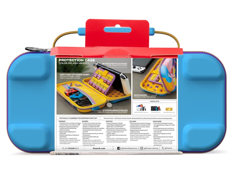 Ta med din Nintendo Switch - OLED-modell, Nintendo Switch eller Nintendo Switch Lite på språng med detta robusta kompakta fodral designat för att passa konsolen i handhållet läge. Inuti hittar du ett filtfoder, skärmskyddsflik med förvaring för nio spelkort, logotyp och förvaringsficka i nät med dragkedja. Det här bärbara fodralet ger dig friheten att ha kul när du är på språng med din Nintendo Switch. Överallt. När som helst.