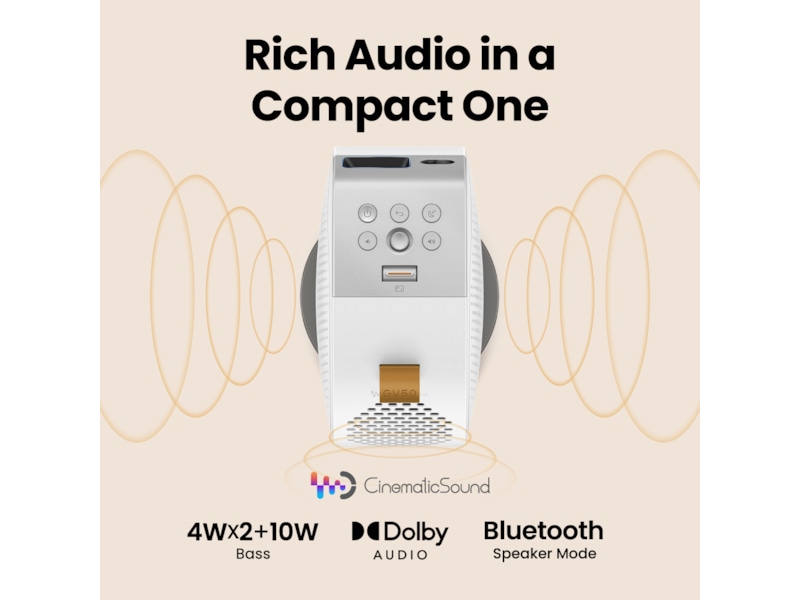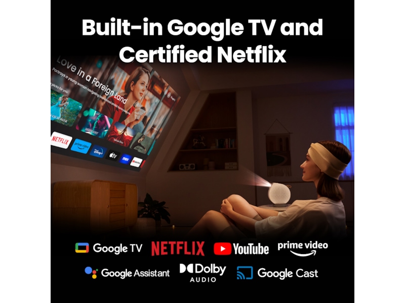Upplev den ultimata komforten med GV50. Perfekt för avslappnade filmkvällar, dess flexibla basdesign möjliggör sömlös takprojektion direkt från din säng. Njut av kvadratiska bilder utan ansträngning med autofokus, 2D keystone-korrigering. Med inbyggd Google TV, Netflix och stöd för AirPlay och Chromecast är det ditt uppgraderade underhållningsnav. Dessutom garanteras levande bilder med dess laserljuskälla som levererar 500 ANSI Lumen och 98 % Rec.709 brett färgomfång. Och glöm inte den rika 2.1-kanaliga ljudupplevelsen, tack vare dess 270-graders 18W Bluetooth-högtalarsystem.