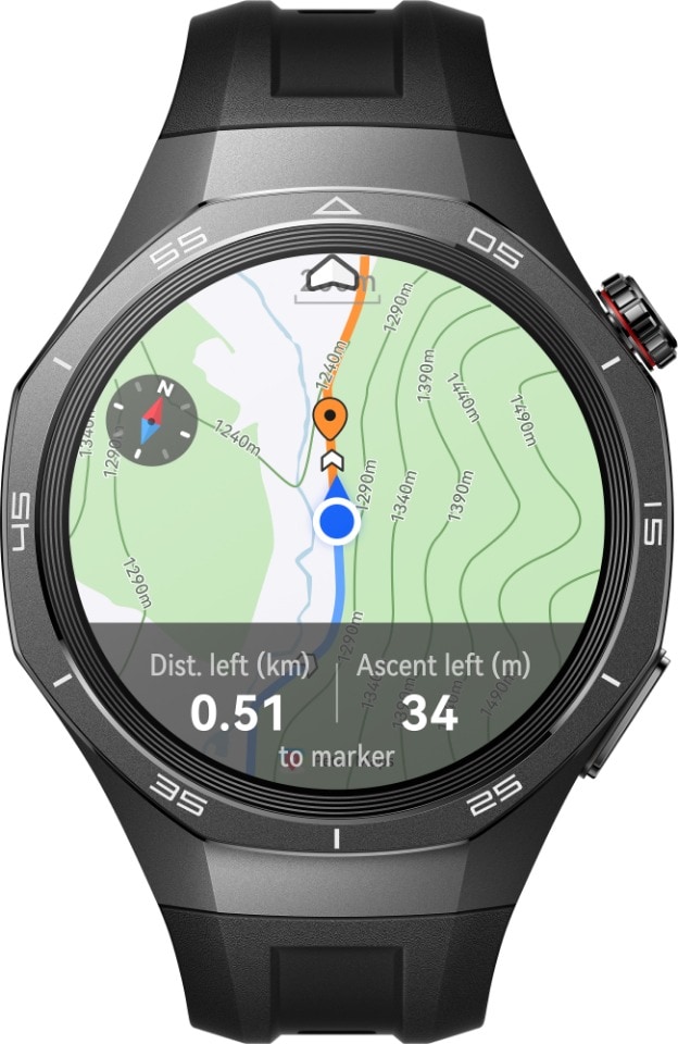 11. Denna funktion kommer att göras tillgänglig via OTA-uppdatering. Tillgänglighet är beroende av officiella utgåvor och faktiska villkor. För att använda segmentbaserad navigering måste du ladda ner motsvarande rutt med markerade punkter från en tredje part, importera rutten till Huawei Health-appen på din telefon och synkronisera rutten med din bärbara enhet. Öppna sedan träningsappen på din klocka, gå in i Trail run-inställningarna, tryck på "Rutter", hitta din destinationsrutt och börja löpningen. För att använda kartbaserade rutter måste du ladda ner motsvarande offlinekarta och höjdlinjer från Huawei Health-appen på din telefon och synkronisera informationen med din klocka. Starta sedan en utomhusaktivitet från Fitness-appen på din klocka, vänta på att positioneringen ska fungera och svep upp eller ner på datakorten för att se den kartbaserade rutten med höjdlinjer.