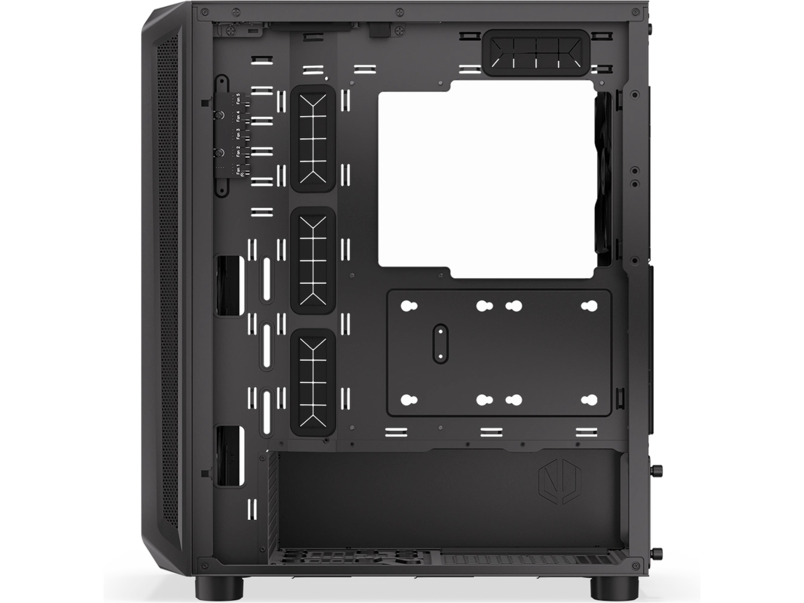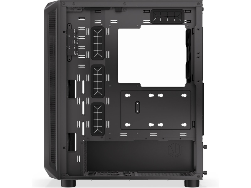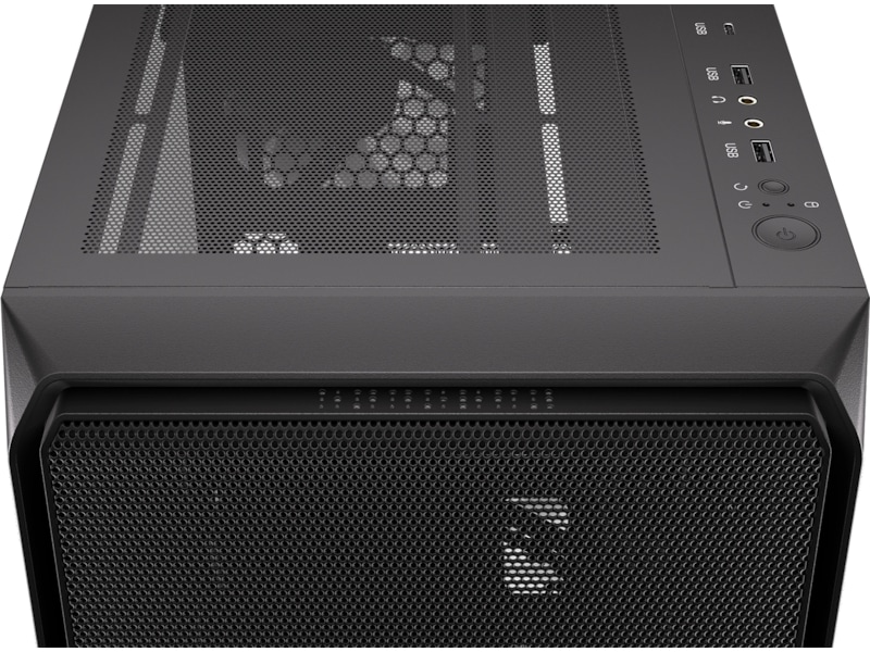 Egenskaper hos systemkabinett Dammfilter till överdel, Stöd för 120/140 mm element bak, Nedre dammfilter, Konstruktion med högt luftflöde, återställningsknapp, Strömknapp, Stöder 120/240/280/360 mm element i främre panel, Stöder 120/240/280 mm element högst upp, Främre dammfilter
