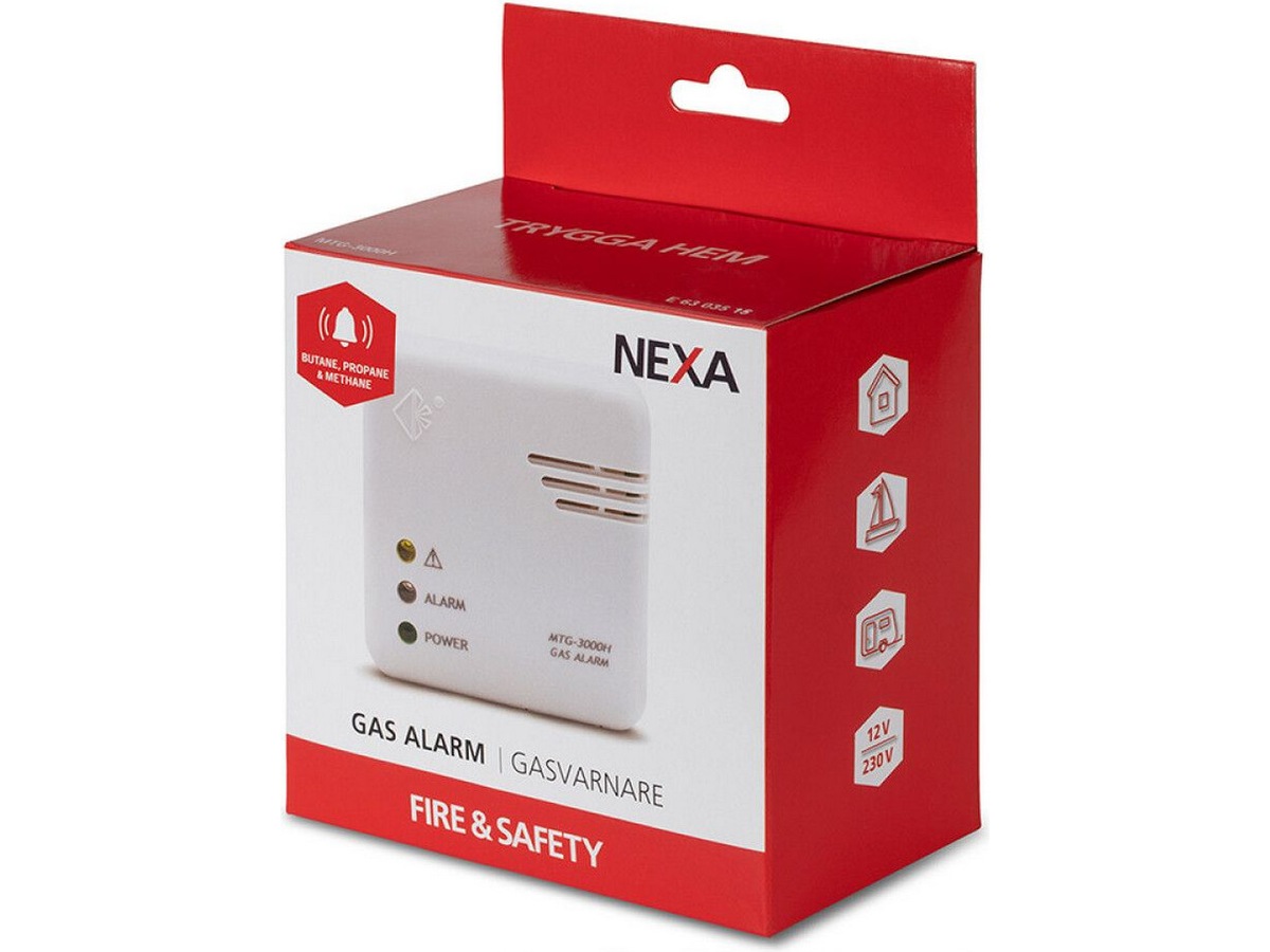 Detekterar och larmar snabbt vid läckage av gasol, naturgas och stadsgas. Larmar ej vid så kallad narkosgas.