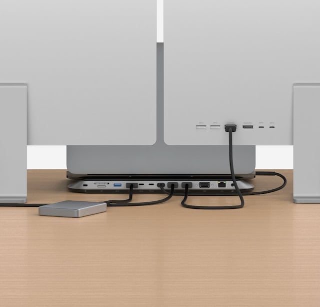 Denna dockningsstation fungerar som ett stativ för bärbar dator med centrerad USB-C-sladd som gör placeringen bekväm och problemfri.