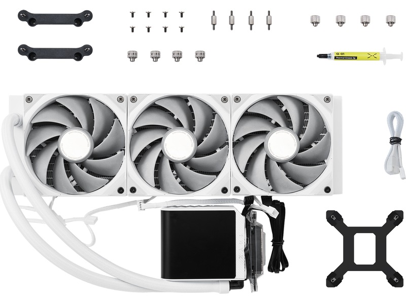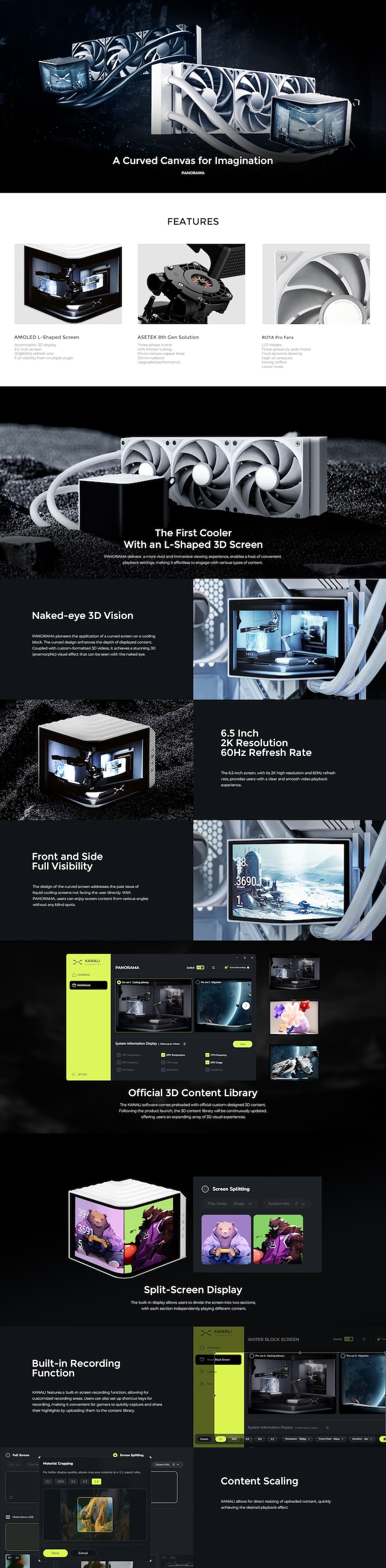 L-formad 6,5" LED-skärm, Trefasmotor, 2k@60Hz uppdateringsfrekvensskärm, Moderkort för VRM-kylfläkt, 8:e generationens Asetek-pump, Fodrade rör (400 mm), A-01 Högpresterande termisk fett, LCP-fläktblad (flytande kristallpolymer), Anamorf 3D-skärm