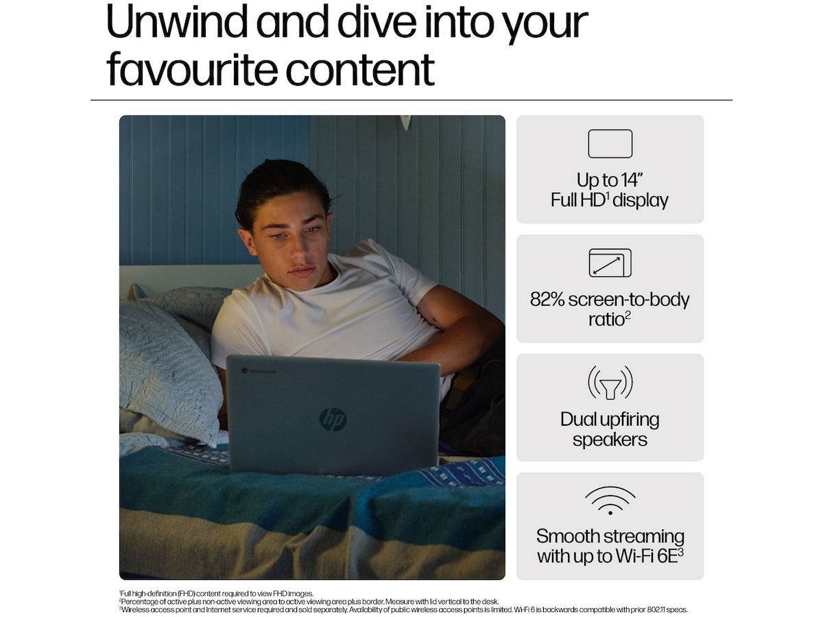 Dyk neri dina favoritprogram med den stora 14- tumsskärmen, dubbla stereohögtalare och trådlös anslutning.