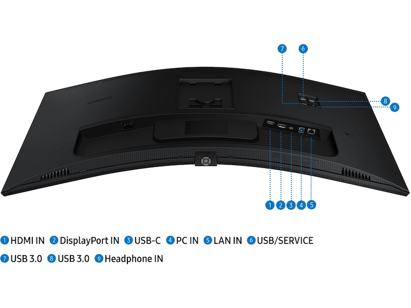 DisplayPort 1.2 (HDCP 2.2), USB 3.0-upstream (Typ B), 3 x USB 3.0-downstream (Typ A), Hörlurar (minijack), LAN (RJ-45), USB-C (ström upp till 90W), HDMI (HDCP 2.2)
