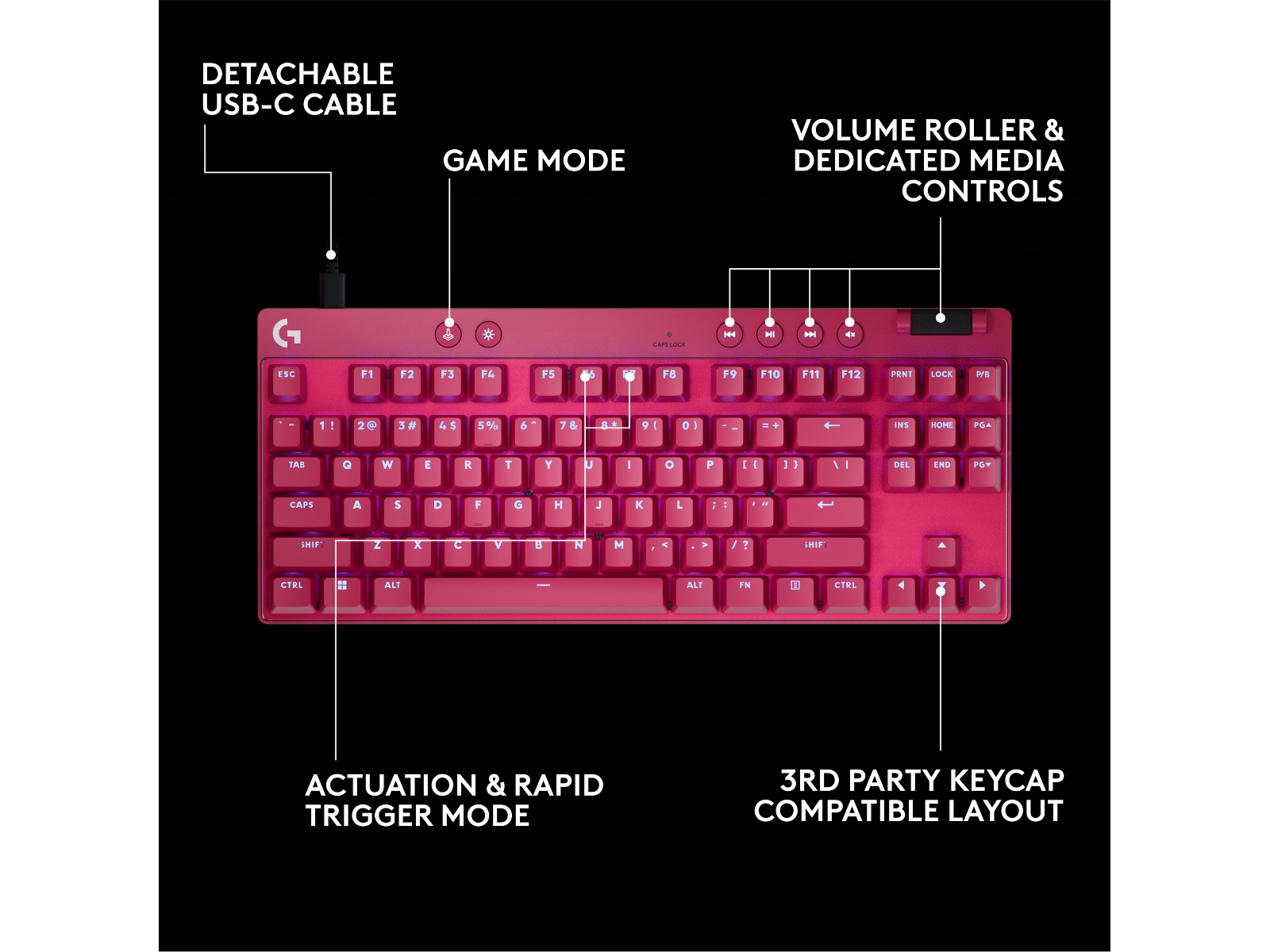 Configure rapid trigger and switch travel on- the-fly, or use Logitech G HUB for precise adjustments. Customize your keyboard with KEYCONTROL and use game mode control key lock for uninterrupted play.