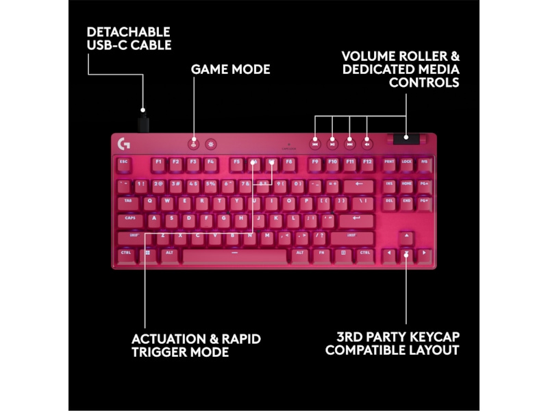 The PRO X TKL RAPID Wired Gaming Keyboard features magnetic analog(Hall- Effect) switches, Rapid Trigger functionality, and actuation at 35g of force—fluid and highly reliable