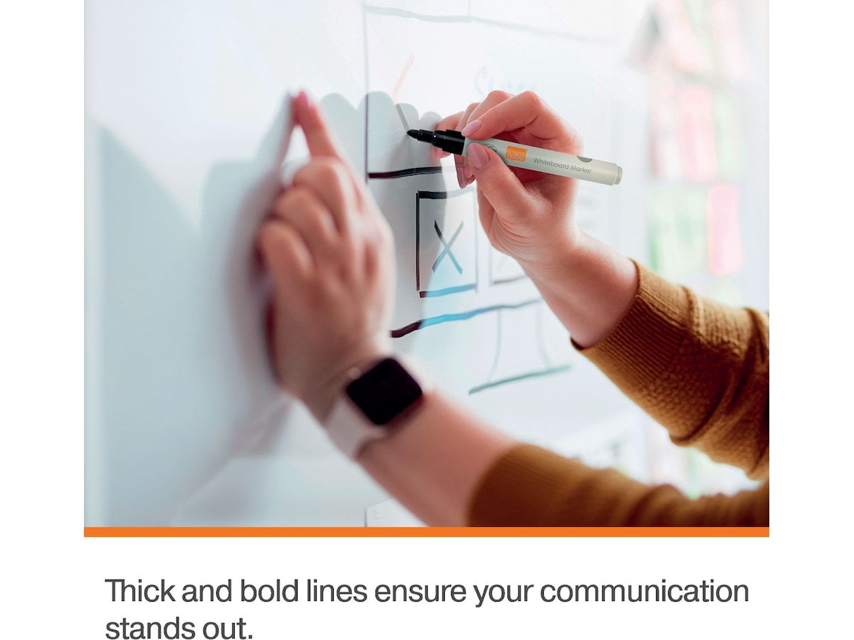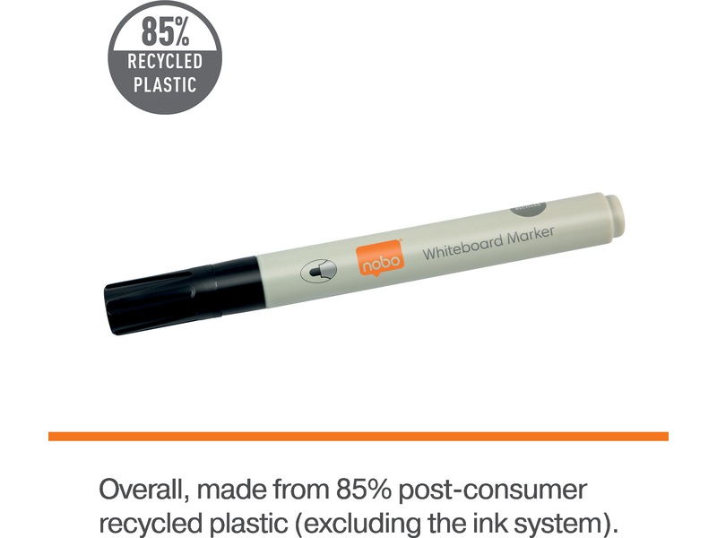 Förbättra dina presentationer och samarbetssessioner med dessa mångsidiga whiteboardpennor för daglig användning. Idealiska för kontor, skolor och hemmabruk, dessa whiteboardpennor ger tjocka, tydliga linjer för användning på icke-porösa ytor som whiteboards, glas och emalj. Dessa svarta markeringspennor har en 3 mm kulspets som säkerställer jämna och smidiga linjer för tydlig och prydlig skrift och har snabbtorkande, luktfri bläck. Inkluderar 4 svarta whiteboard-pennor, gjorda av 85 % återvunnen plast (exklusive bläcksystemet). För optimal prestanda, använd med en Nobo whiteboard. Förpackning med 4 whiteboardpennor.