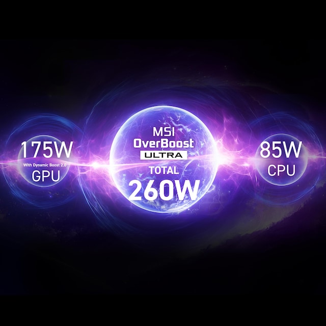 Under extrema arbetsbelastningar som kräver full CPU- och GPU-resurser levererar MSI OverBoost-teknologi toppkombinerad prestanda med en total effekt på 260W