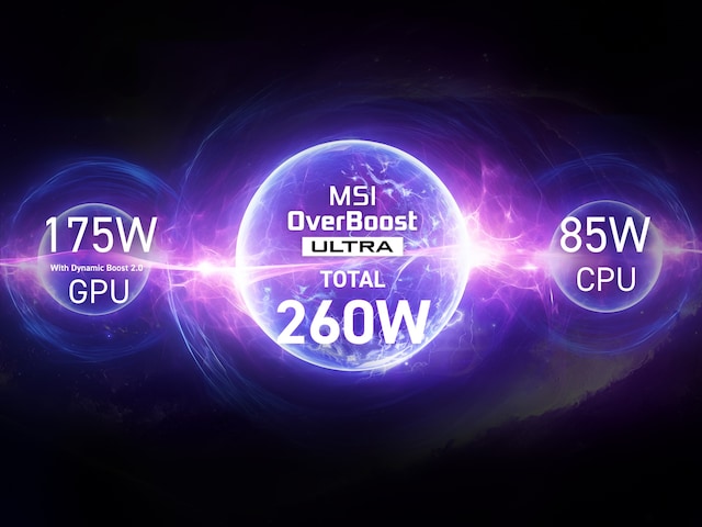 Under extrema arbetsbelastningar som kräver full CPU- och GPU-resurser levererar MSI OverBoost-teknologi toppkombinerad prestanda med en total effekt på 260W
