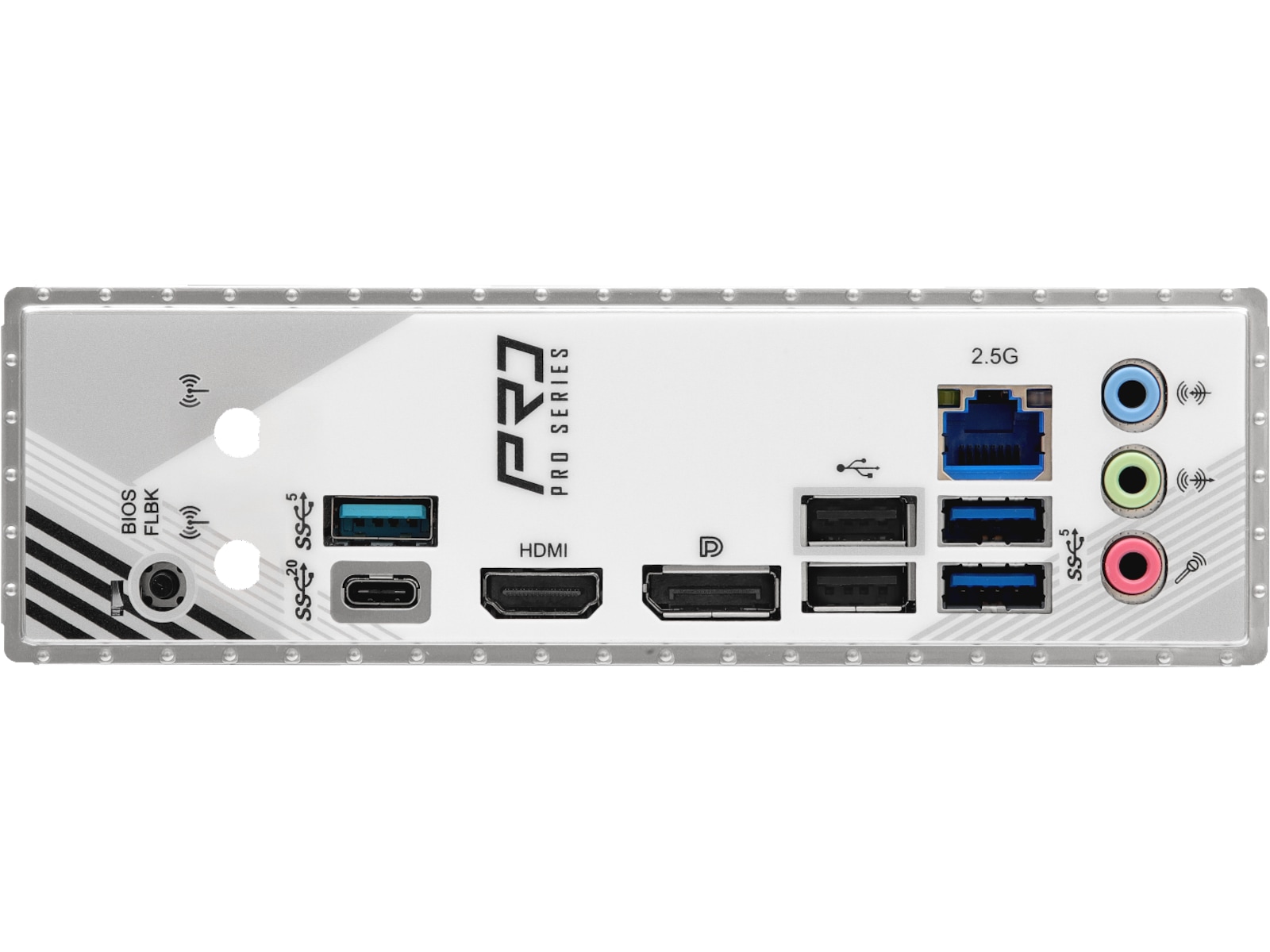Gränssnitt 1 x ljudutgång - mini-jack, 1 x mikrofon - mini-jack, 1 x USB-C 3.2 Gen2x2, 1 x LAN (2.5Gigabit Ethernet), 2 x USB 3.2 Gen 2, 1 x HDMI, 2 x antenn, 2 x USB 2.0, 1 x SPDIF-utgång, 3 x USB 3.2 Gen 1, 1 x DisplayPort